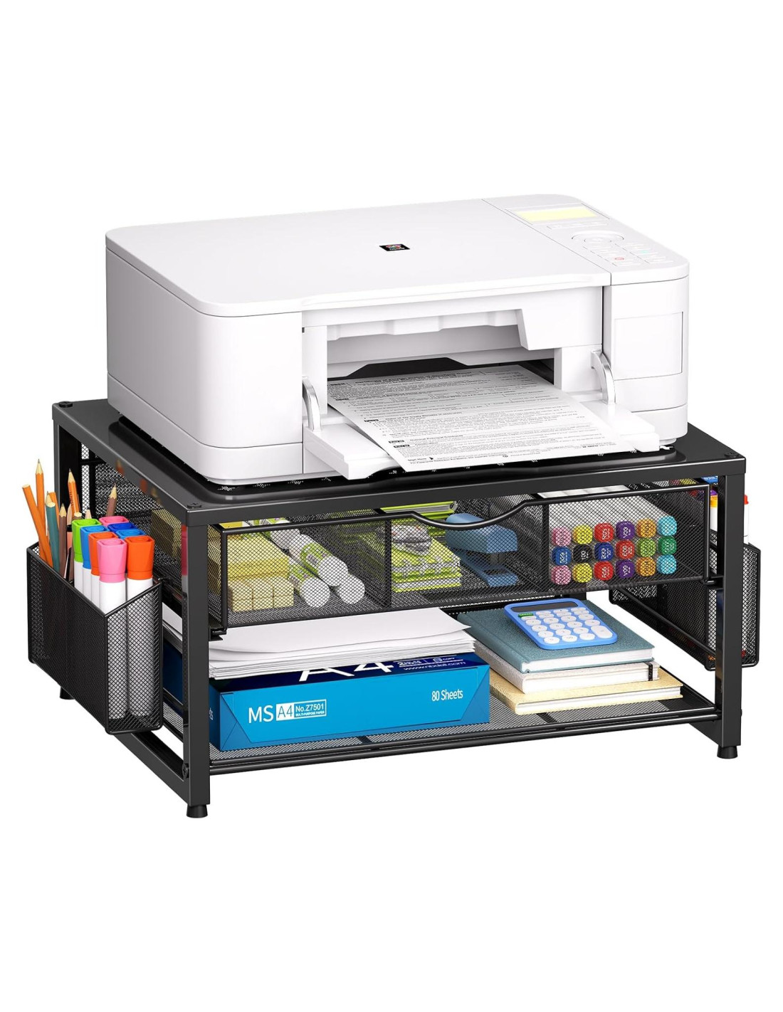 - Mejora del soporte para impresora: Este soporte de escritorio cuenta con un marco de metal, 1 organizador de cajón, 1 bandeja para cartas y 2 soportes para bolígrafos, lo que hace que el soporte sea una opción ideal para gestionar un escritorio. La multifuncionalidad te ayuda no solo a ahorrar espacio para la impresora, sino también a mantener los gadgets de escritorio y la papelería limpios y ordenados.