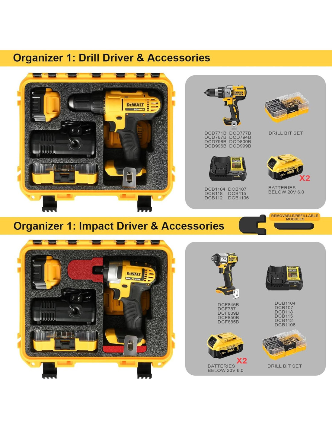 - Diseño de espuma modular para compatibilidad dual: sistema de inserción de espuma personalizable; retira módulos seleccionados para ajustar un taladro inalámbrico Dewalt 20V MAX, o añádelos de nuevo para un ajuste ceñido con el destornillador de impacto. Un estuche, dos configuraciones para máxima flexibilidad.