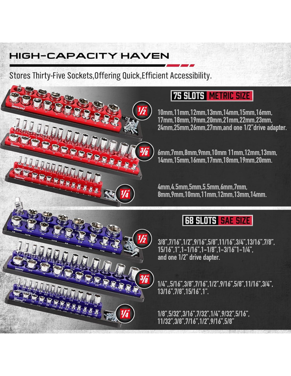 - GRAN CAPACIDAD - Almacena 141 enchufes métricos y SAE de manera eficiente; incluye bandejas métricas azules y SAE rojas para drives de 1/4" (6.35 mm), 3/8" (9.53 mm) y 1/2" (12.7 mm).