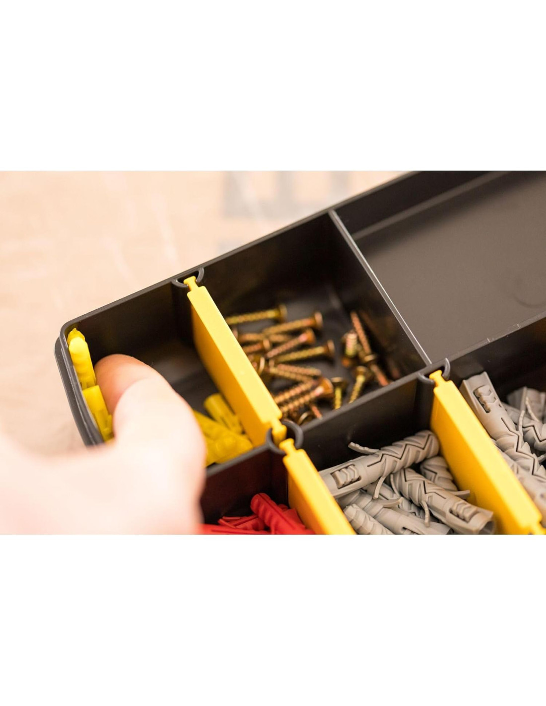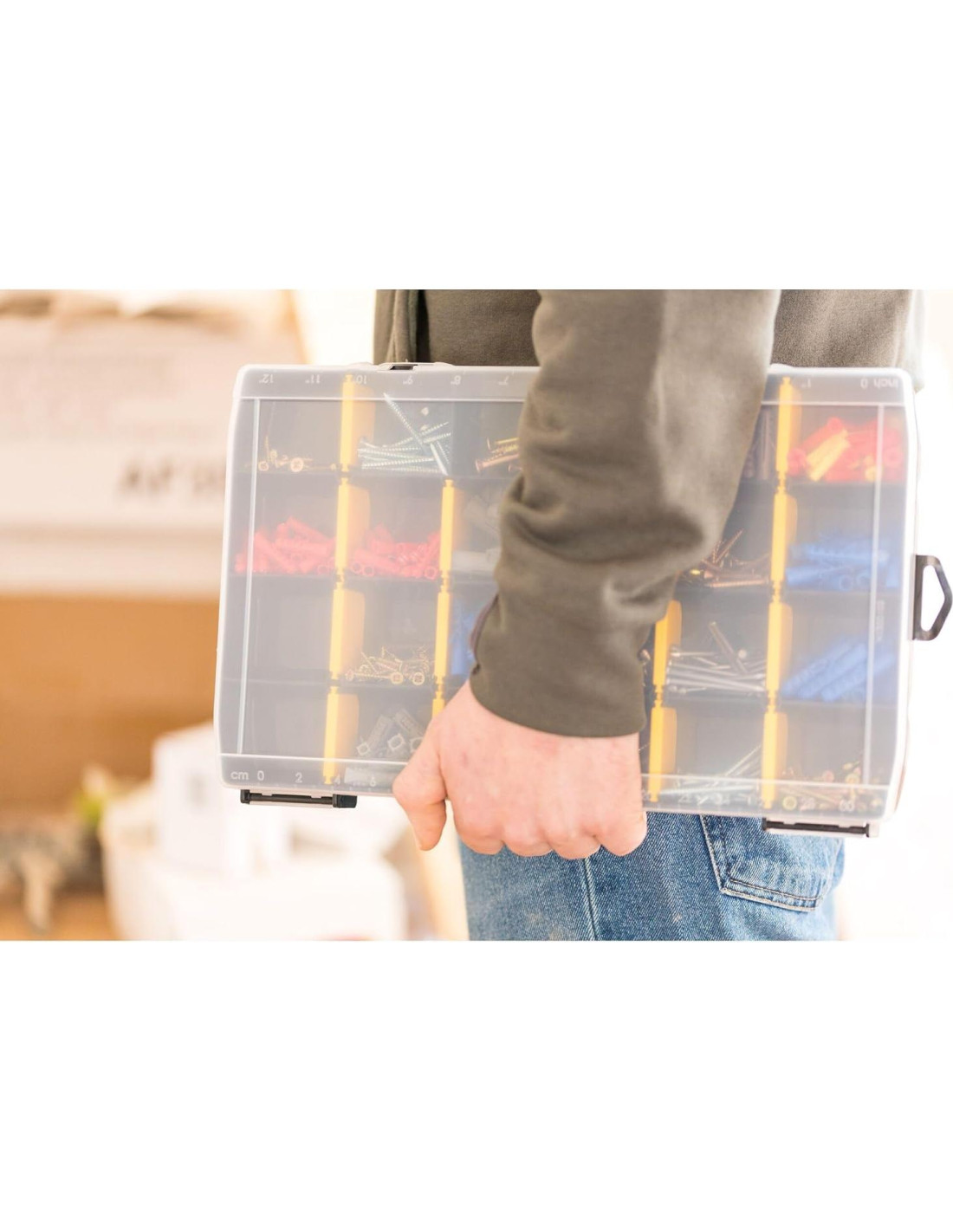 - Orden en el taller: la caja de organización STANLEY ofrece una solución pensada para almacenar y clasificar accesorios y piezas pequeñas, con sus 17 compartimentos y construcción robusta, asegura orden y claridad en cualquier taller, adecuada para artesanos y entusiastas del bricolaje que valoran un entorno de trabajo bien organizado