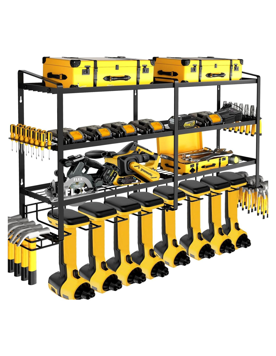 - [Soporte para 8 Taladros Extra Grande y Diseño de Alta Capacidad de 4 Capas] Este organizador de herramientas eléctricas utiliza el último diseño de alta capacidad de cuatro niveles. La capa inferior puede almacenar 8 taladros inalámbricos, las tres capas superiores pueden almacenar otras herramientas pesadas o varias herramientas pequeñas. La capa superior e inferior en los lados izquierdo y derecho están provistas respectivamente de un soporte para alicates, organizador de destornilladores, espacio de almacenamiento de martillos móvil y estante flotante para colgar varias herramientas flotantes.