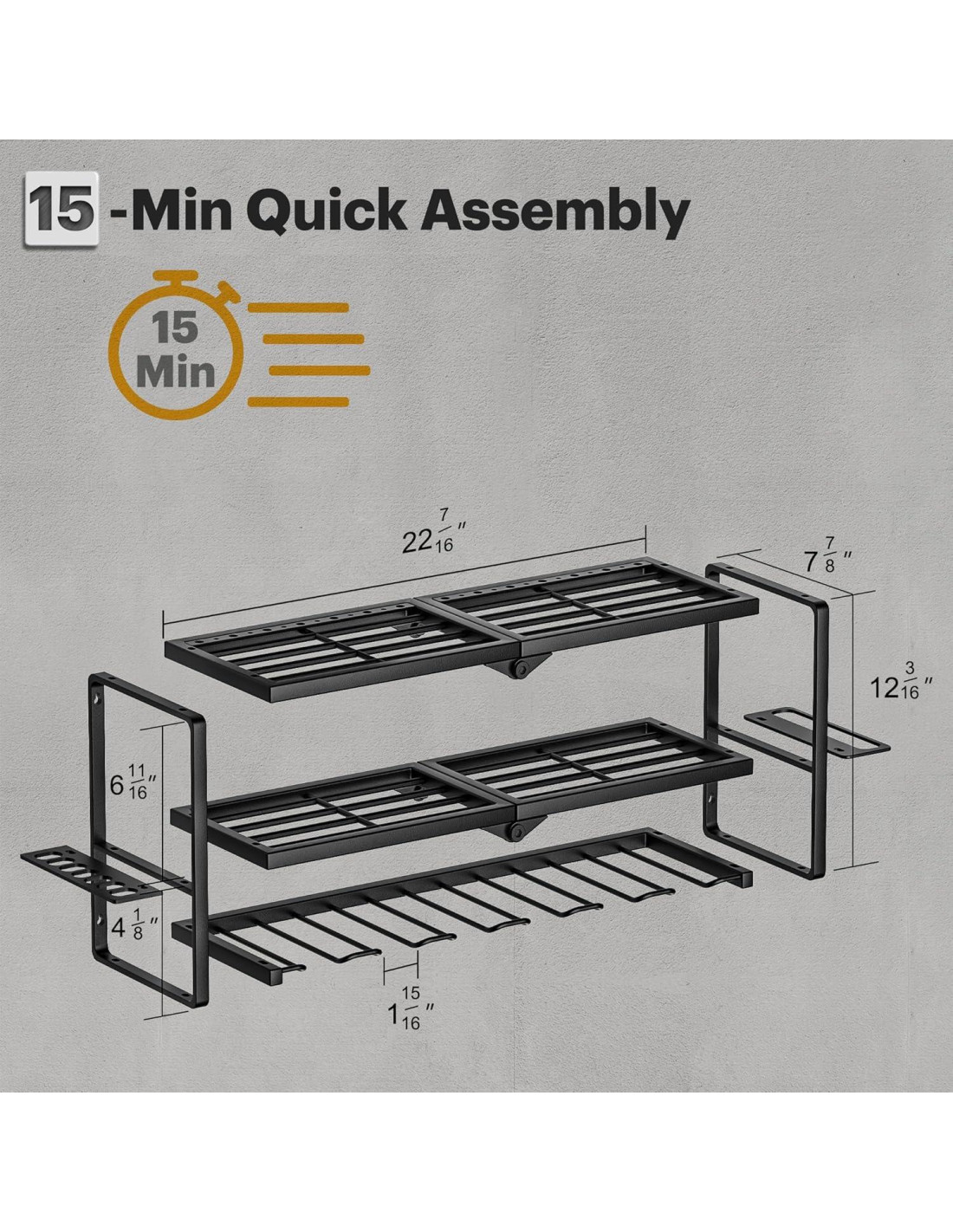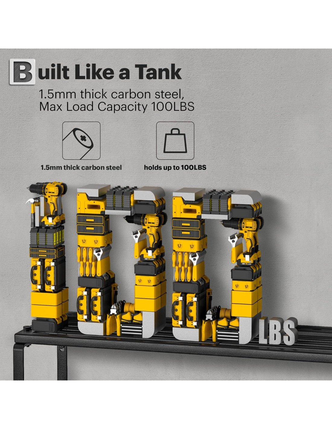 - Maestro de Almacenamiento de 3 Capas: Este organizador de herramientas eléctricas cuenta con un diseño de 3 capas, un nivel inferior que puede sostener de 6 a 8 taladros inalámbricos, un nivel medio que es extra ancho y alto para acomodar herramientas de alta resistencia o varios accesorios pequeños, y compartimentos laterales equipados con soportes para martillos, alicates y destornilladores para una organización definitiva