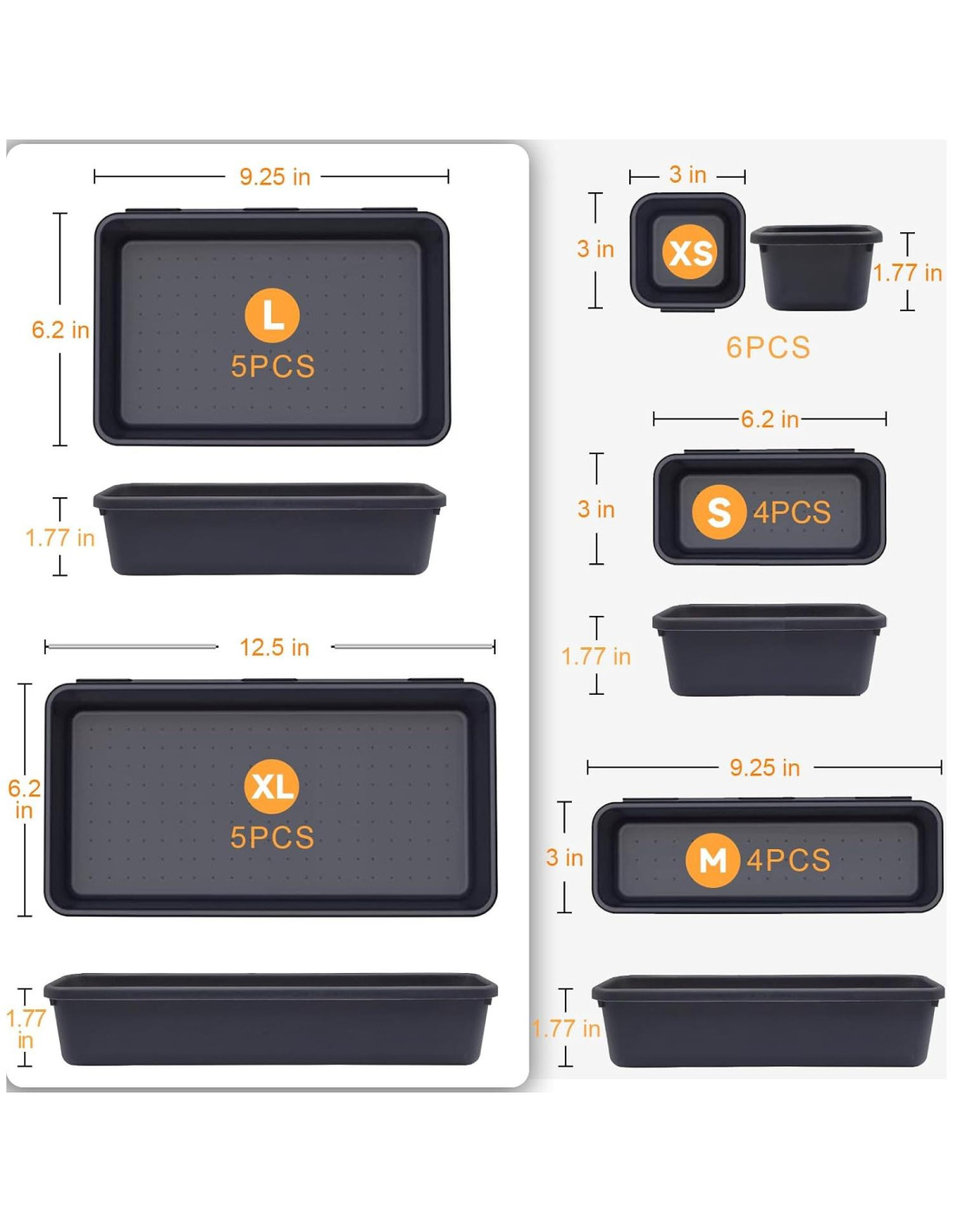- [24 Paquete y 5 Tamaños] - Nuestros recipientes organizadores de caja de herramientas incluyen 24 bandejas: 5 x tamaño XL (31.75x15.75x4.5 cm), 5 x tamaño L (23.5x15.75x4.5 cm), 4 x tamaño M (23.5x7.62x4.5 cm), 4 x tamaño S (15.75x7.62x4.5 cm), 6 x tamaño XS (7.62x7.62x4.5 cm).