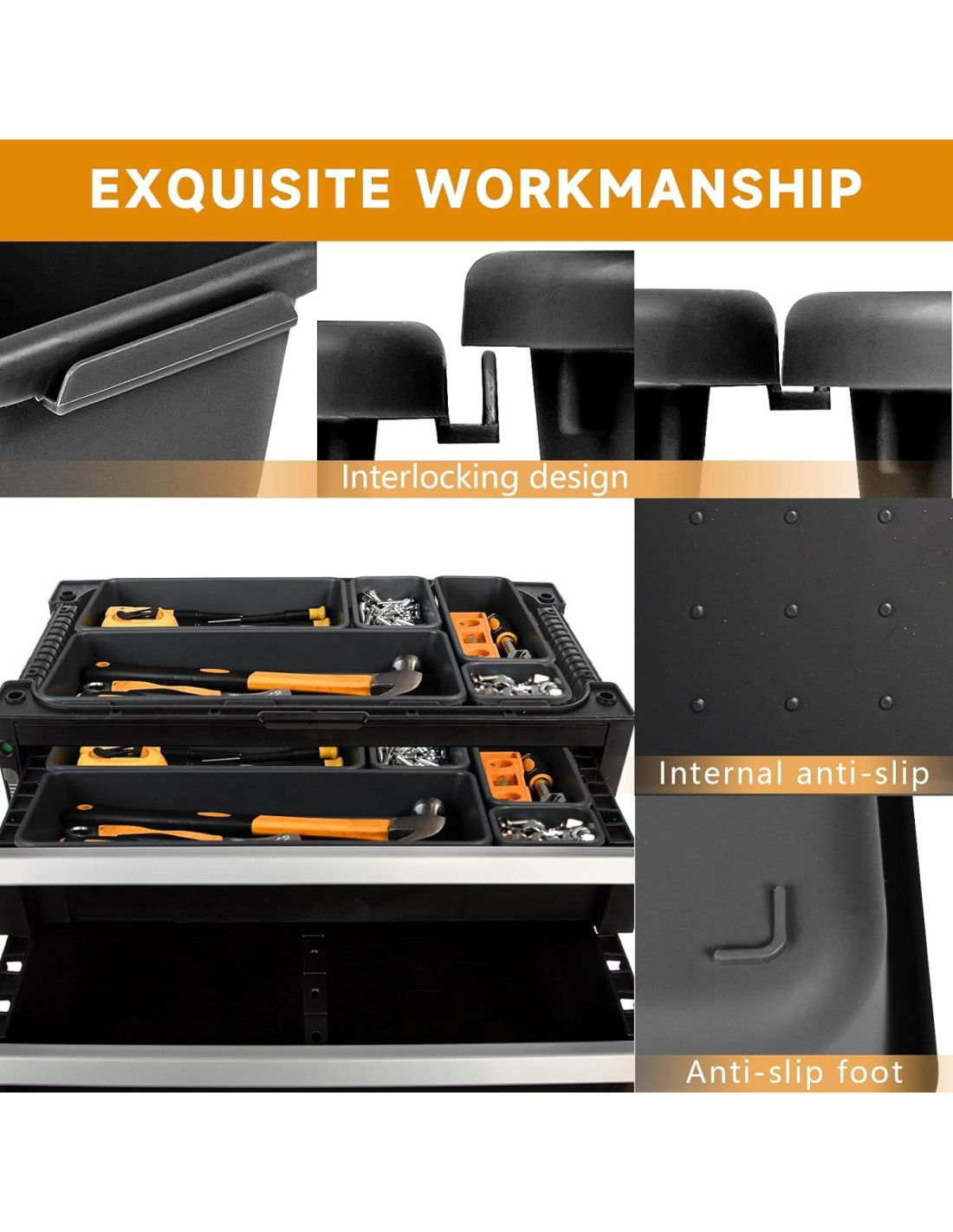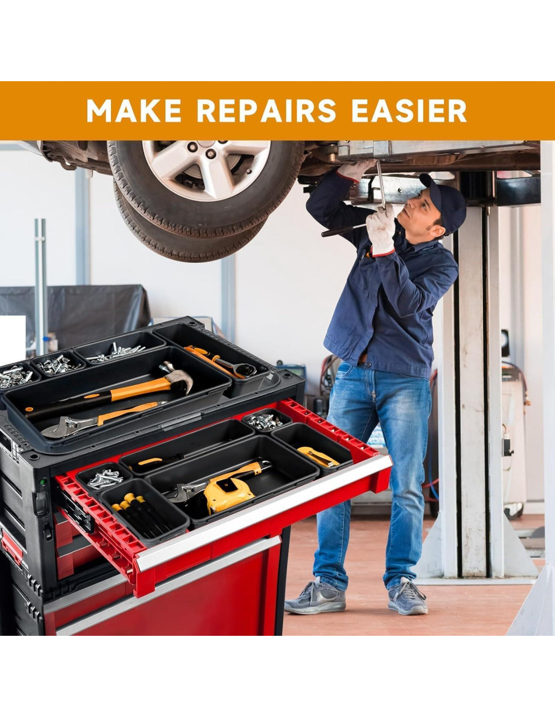 - [Diseño Interconectable] - Nuestro organizador de caja de herramientas adopta un diseño interconectable, que puede ayudarte a mantener todas las herramientas organizadas, todas las bandejas separables se pueden usar solas o unirse y personalizar tu espacio de almacenamiento.