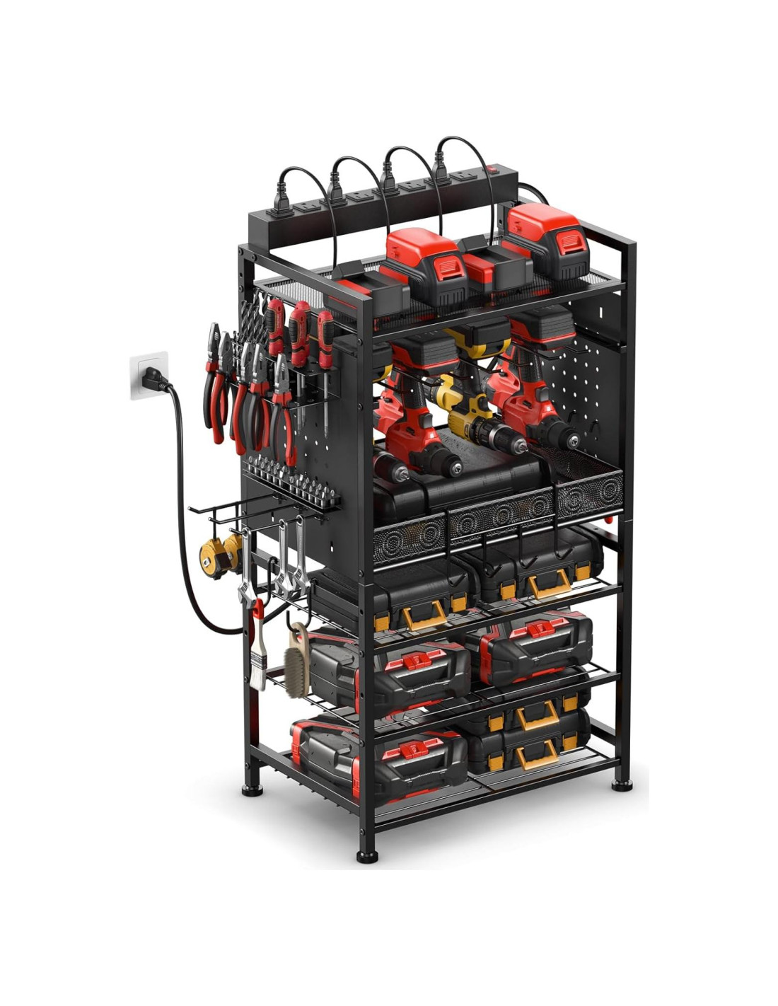 - Organizador de Herramientas Todo en Uno: Nuestro organizador de herramientas eléctricas con regleta de 8 salidas adopta un diseño de soporte de piso de 6 capas, incluyendo 4 estantes, 1 capa de cesta de almacenamiento y 1 capa de soporte para taladros que puede almacenar hasta 8 taladros o usarse como ganchos. Diseño de panel lateral de tablero de clavijas con organizador de puntas y soporte para destornilladores. Equipado con cuatro tipos de ganchos adicionales. Acomoda varias herramientas de taller como baterías, cajas de herramientas, destornilladores, puntas de destornillador, alicates, cintas métricas, etc.