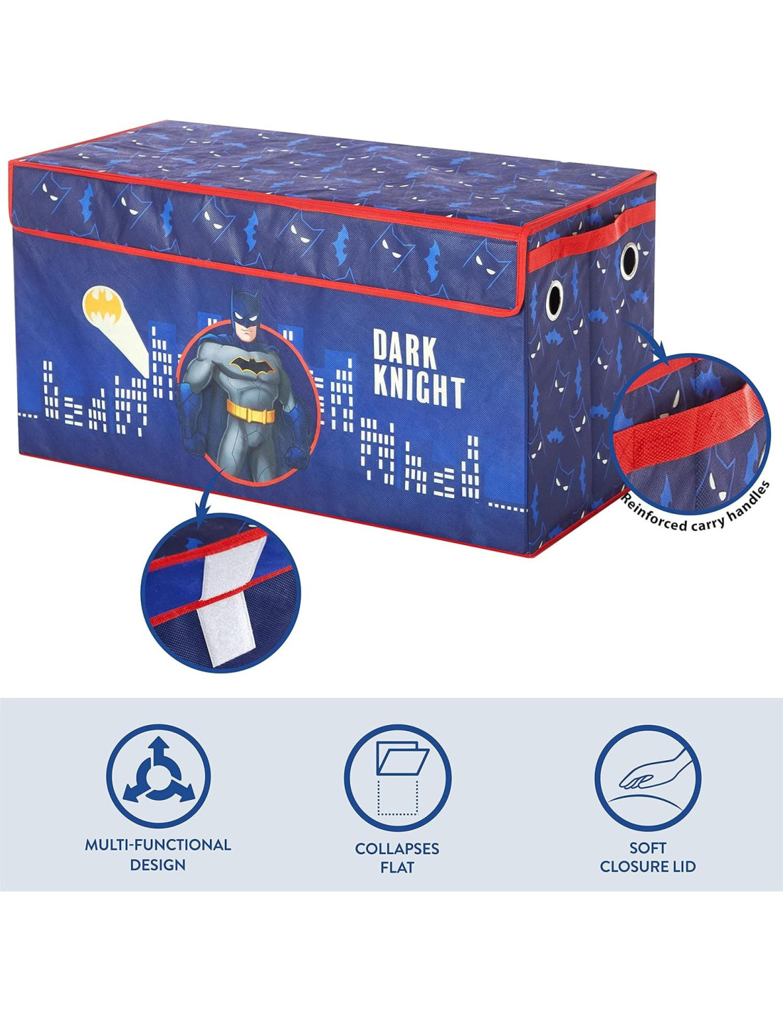 - DISEÑO AMIGABLE PARA NIÑOS: Este espacioso cofre de almacenamiento presenta gráficos adorables de Batman. La adición perfecta para la habitación, armario o sala de juegos de su hijo. El diseño de este cofre de almacenamiento añadirá un toque de color junto con los personajes favoritos de su hijo. El cofre de almacenamiento plegable es una forma fácil de mantener el desorden, mientras agrega un acento juguetón.