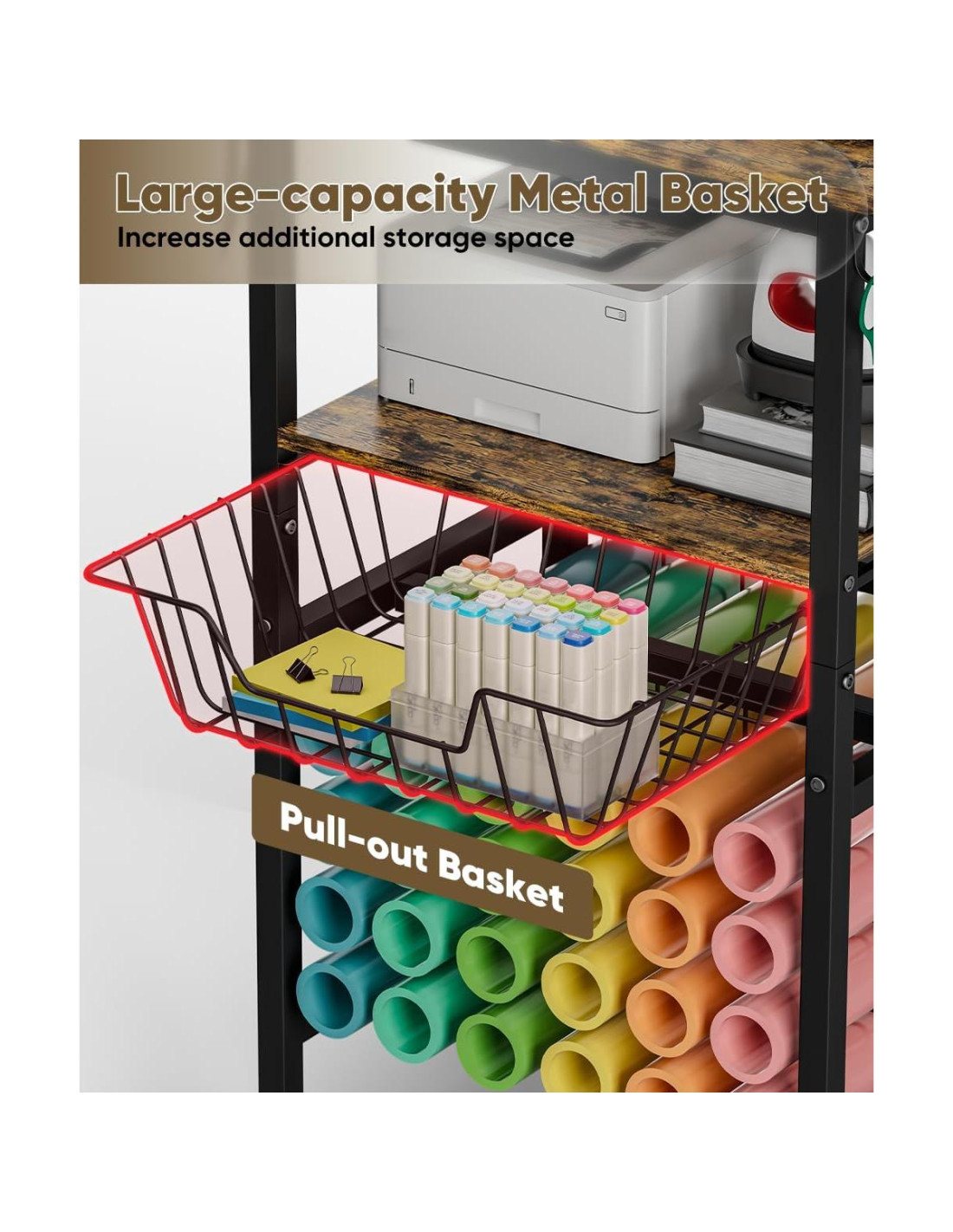- [Almacenamiento Masivo de Vinilo y Suministros] El organizador de rollos de vinilo incorporado sostiene hasta 24 rollos debajo del carro, manteniendo tus materiales ordenados y accesibles. Cestas y ganchos adicionales proporcionan espacio extra para cuchillas, mats, bolígrafos y otros accesorios Cricut-sin más mesas desordenadas.