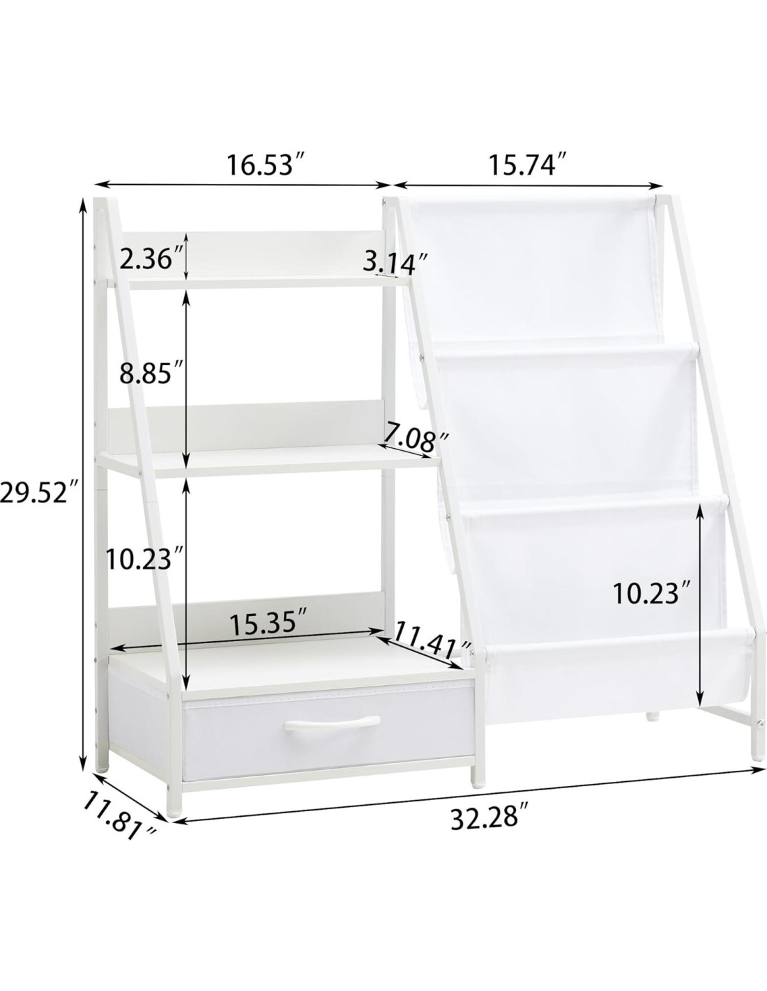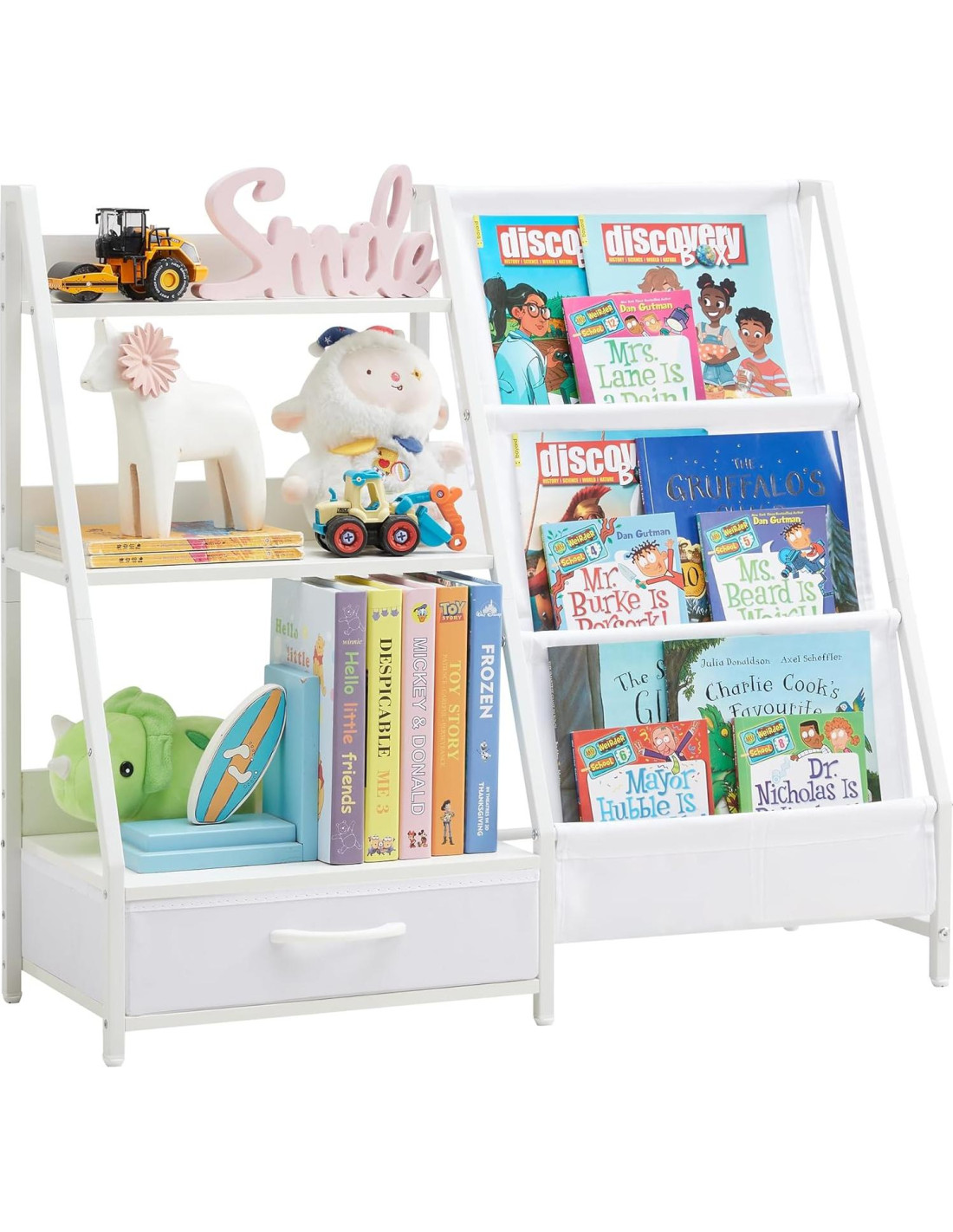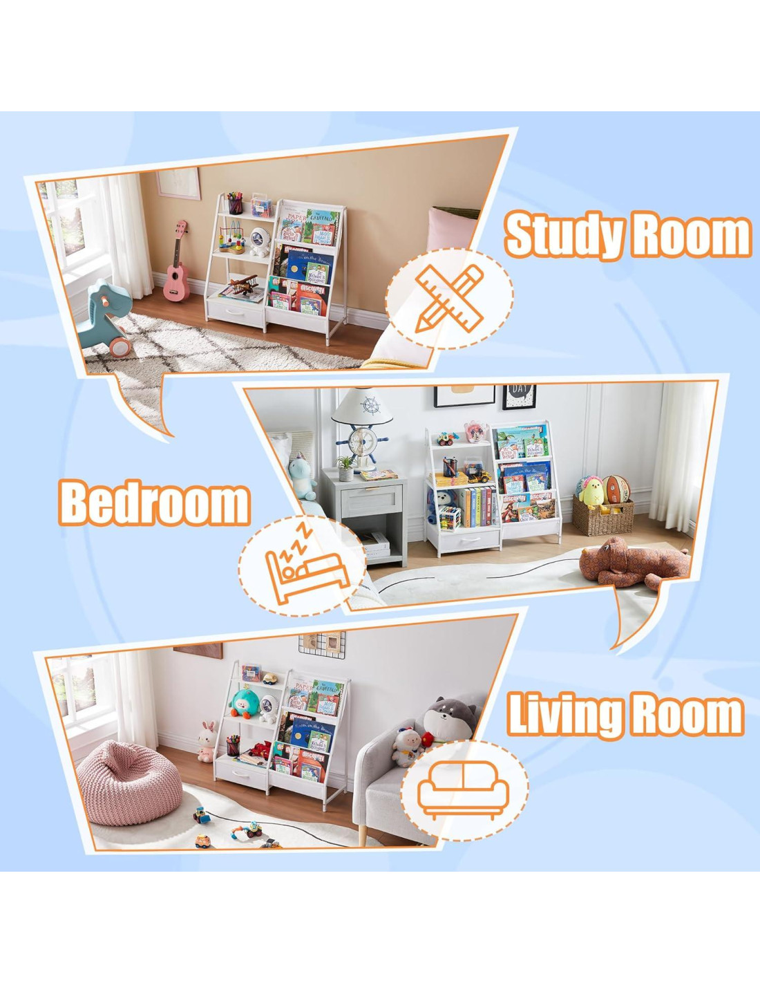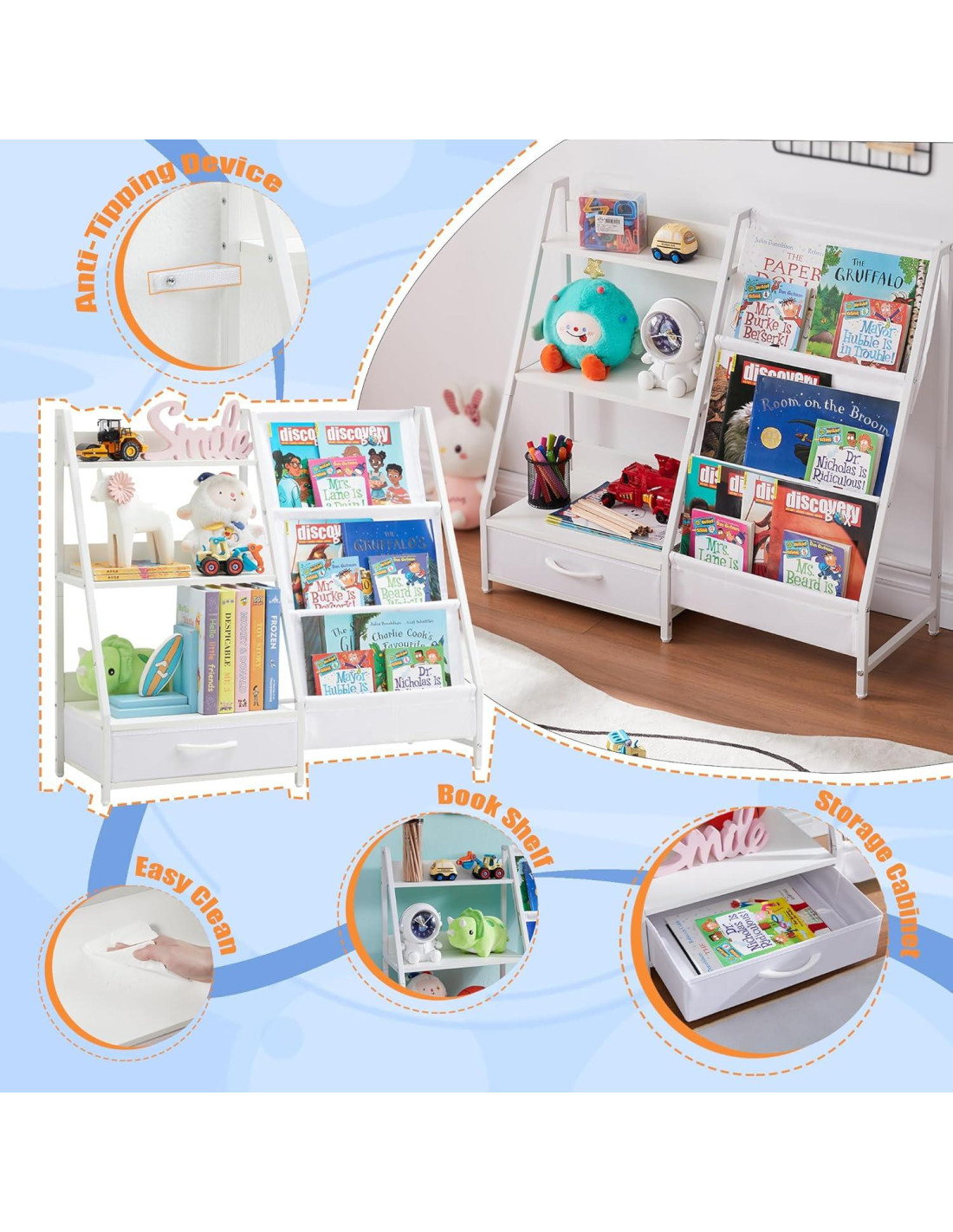- Diseño 2-en-1 - Esta estantería para niños que ahorra espacio cuenta con un diseño versátil con bolsillos de almacenamiento de libros de 3 niveles y almacenamiento de juguetes de 3 niveles, junto con un amplio cajón de almacenamiento. La bolsa de almacenamiento de libros muestra los libros con las portadas frontales a la altura perfecta para que los niños pequeños y los niños puedan identificar y acceder fácilmente. El ensamblaje es rápido y sin complicaciones con todos los accesorios necesarios incluidos.