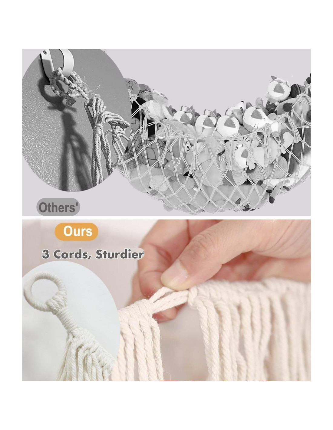 - HECHO A MANO Esta sujeción de peluches está 100% tejida a mano con cuerda de algodón puro natural. Está diseñada para colgarse en la pared y formar un bolsillo con hermosos flecos largos.