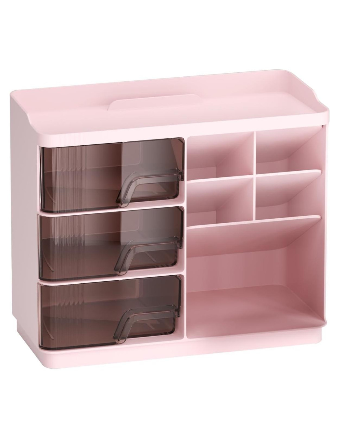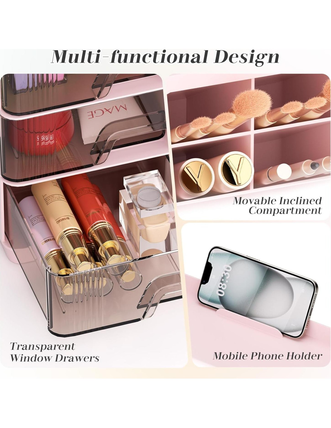 - Almacenamiento Elegante y Eficiente: Este organizador de tocador, que cuenta con tres cajones y cuatro compartimentos inclinados, también funciona como soporte para brochas de maquillaje. Puede almacenar ordenadamente varios artículos de belleza como labiales, sombras de ojos, base, esmalte de uñas, paletas de sombras de ojos y productos de cuidado de la piel.