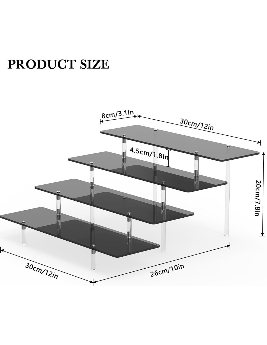 - [Tamaño perfecto para amplia aplicabilidad] Después de la instalación, el tamaño es 30 x 28 x 20 cm (L x B x H) y el tamaño de la placa de acrílico en cada capa es 30 x 8 cm, que se puede usar para presentar coleccionables como muñecas, modelos de figuras, copas de vino, rocas, cristales y joyas, así como lápiz labial, esmalte de uñas, perfume y otros cosméticos, estantes de especias en la cocina, soportes para cupcakes en fiestas, bocadillos, cenas tipo buffet, soportes para copas de vino, etc.