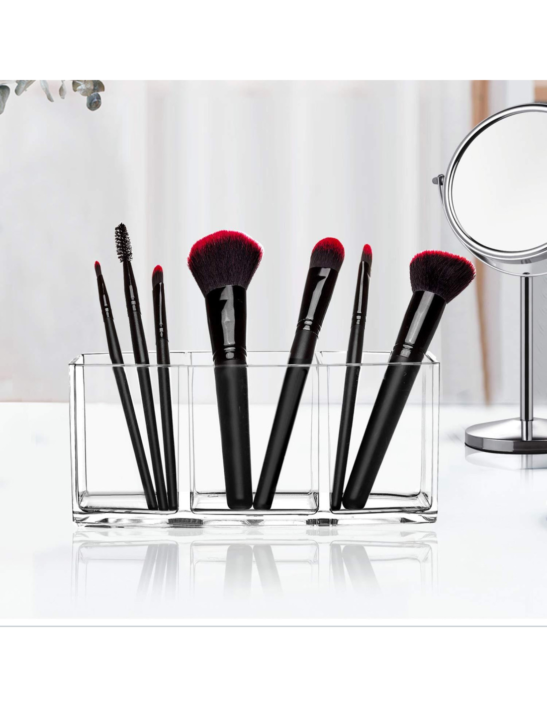 - TAMAÑO: 17.97 centímetros L x 7.11 centímetros W x 8.06 centímetros H. El diseño aerodinámico proporciona opciones de almacenamiento compacto, cuenta con 3 compartimentos separados, puede caber al menos 20-30 brochas de sombra de ojos en un compartimento. Un contenedor sostiene más de 50 brochas de maquillaje grandes y pequeñas mezcladas, que son perfectas para usar en la encimera.