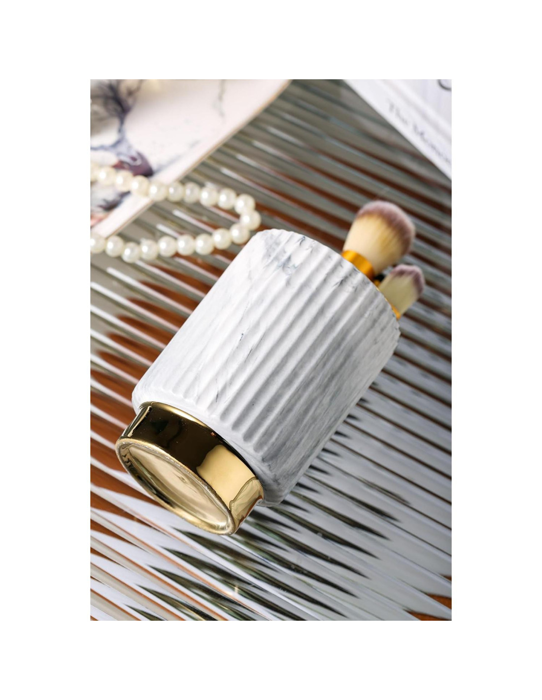 - DISEÑO: La clásica combinación de gris y dorado con diseño a rayas permite que este organizador de maquillaje sea más hermoso y a la moda. La base y el borde del tubo de la boca del soporte de maquillaje están diseñados con un recubrimiento metálico dorado, convirtiéndose en una obra de arte, permitiéndote experimentar una sensación de lujo y un efecto visual.
