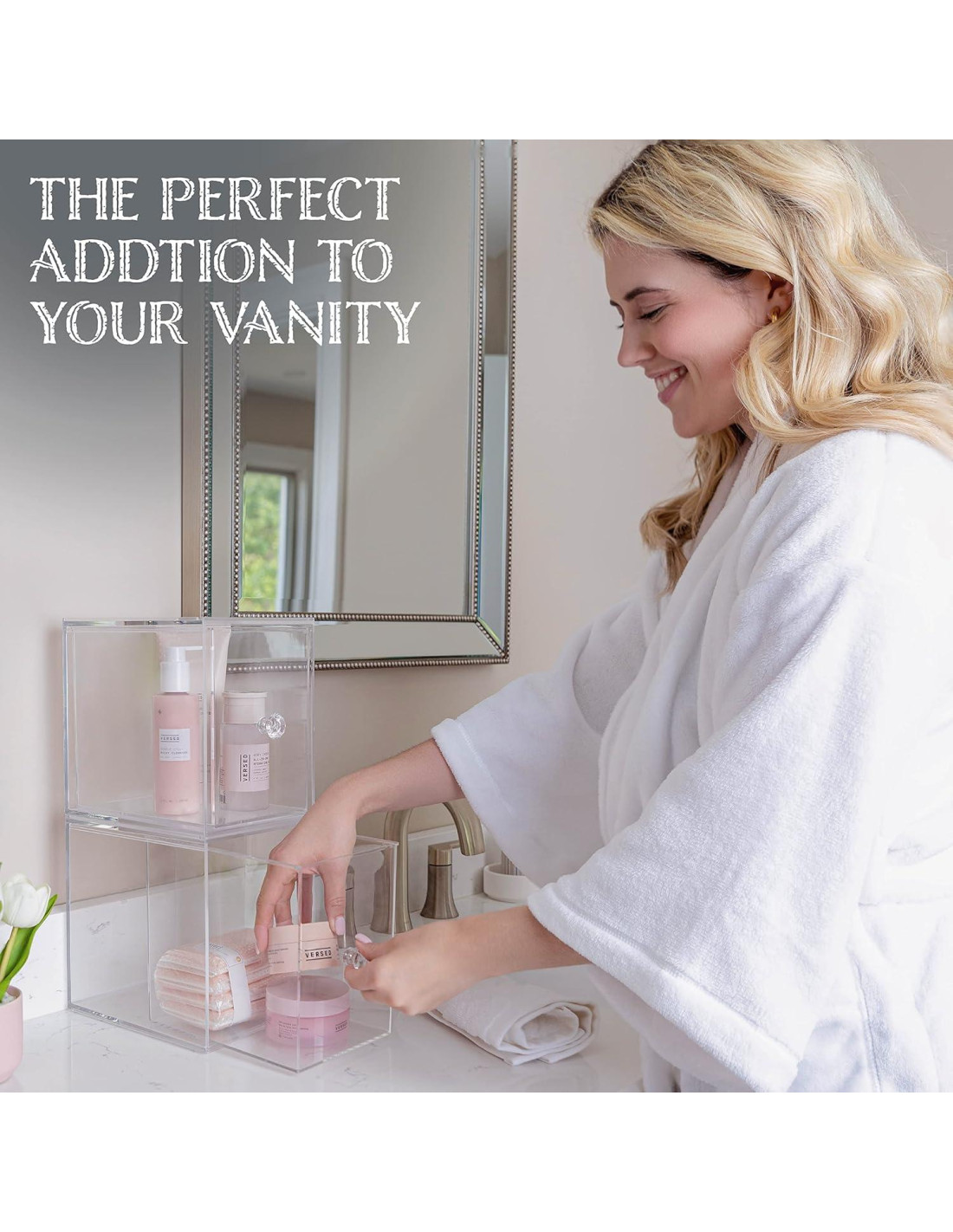 Ahorra Espacio Apilable Úsalo solo, uno al lado del otro, o apílalos para ahorrar espacio. Los cajones se entrelazan perfectamente uno encima del otro para crear una unidad modular suave y a medida. Diseño Elegante Elegante y translúcido, estos cajones complementan cualquier estilo y se verán geniales en cualquier lugar donde se coloquen, tanto en casa como en la oficina. Organizador Multifuncional Hermoso como un tocador de baño para almacenar cosméticos y igualmente perfecto para mantener manualidades, costura, accesorios y suministros de oficina organizados y fácilmente visibles.