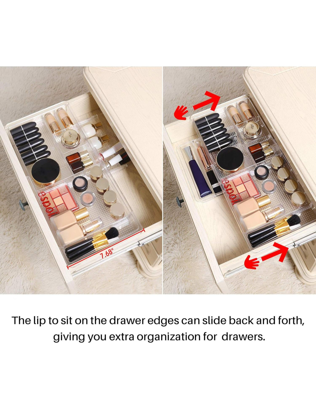Un organizador elegante y que ahorra espacio que almacena productos para el cuidado de la piel, cosméticos y brochas, ideal para tocadores, cómodas o baños. Adecuado para cajones de baño para poner y así sucesivamente. Como un organizador perfecto para el cajón de escritorio, puedes usarlo para todos tus. Ideal para almacenar artículos como en tu mostrador, tocador, cómoda o mesita de noche. Con 7 compartimentos además de , se ajustaría a varios tamaños de tu maquillaje. Usualmente tenemos cajones de múltiples capas, así que 4 te ayudarán a organizar todo el cajón. Hecho de material transparente y duradero. Mantén tus cosméticos ordenados y limpios. Se puede colocar horizontal o verticalmente. También puede sentarse en el cajón, dándote organización extra para los cajones.