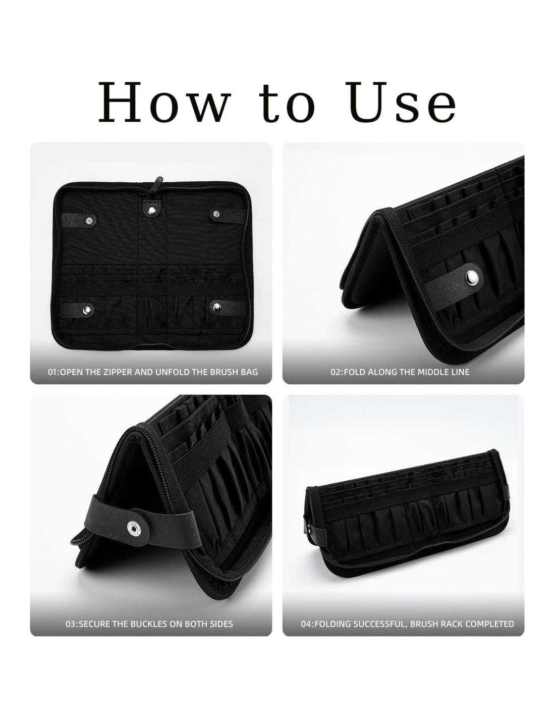 - Portabilidad Conveniente: Esta bolsa de viaje para brochas acomoda brochas de todos los tamaños sin esfuerzo. Simplemente pliega la parte superior hacia abajo y toma la brocha que necesitas. También permite un almacenamiento conveniente de pequeños artículos, combinando funcionalidad y portabilidad.