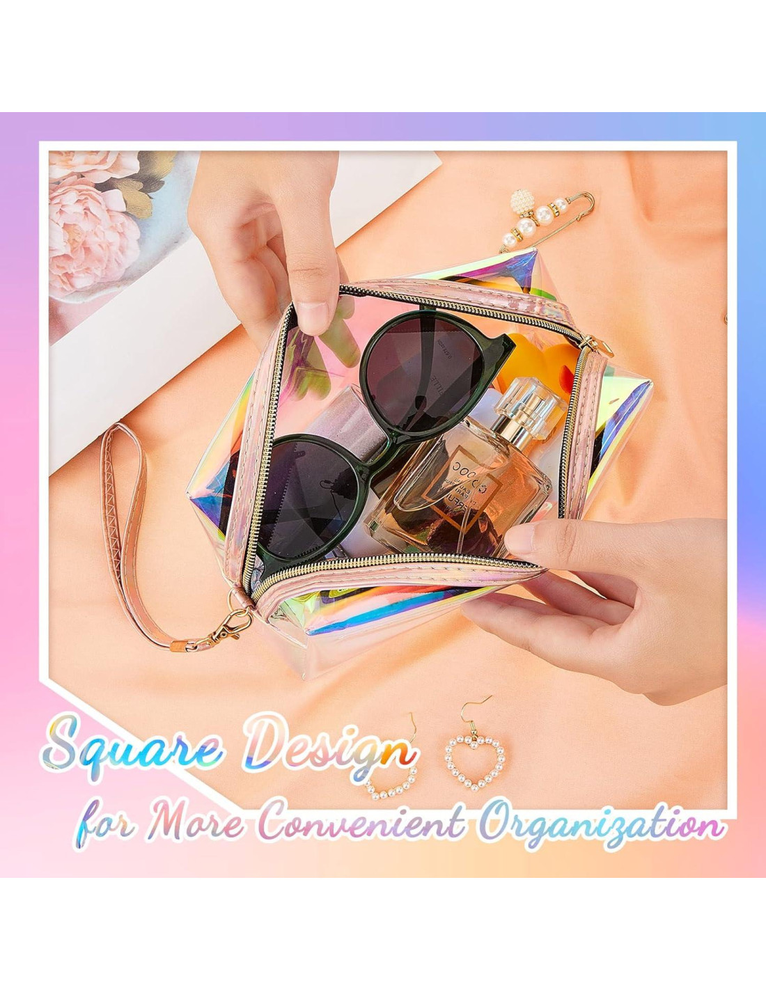 - Diseño Holográfico Claro y Elegante: la bolsa de maquillaje iridiscente brilla a la luz, puedes ver diferentes colores desde diferentes ángulos, el estilo iridiscente hace que la bolsa holográfica se destaque de otras bolsas de maquillaje; El diseño transparente facilita encontrar tus artículos dentro de la bolsa