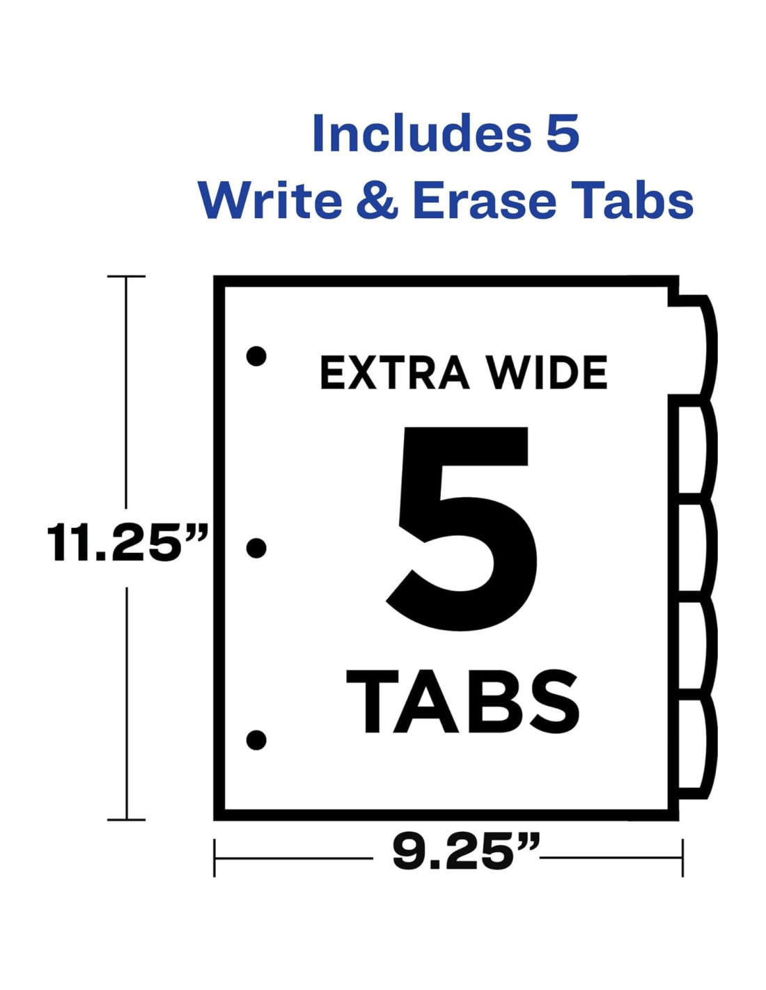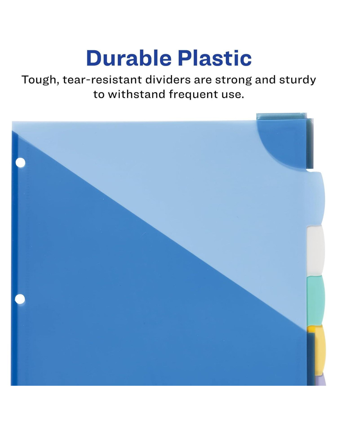 Descripción del Producto Organiza tu carpeta de manera correcta con estos Separadores de Plástico Durable para Escribir. El diseño ancho funciona perfectamente con protectores de hojas para que puedas ver tus tabuladores de un vistazo. El diseño elegante de los tabuladores ofrece mucho espacio para etiquetar cada separador para referencia rápida. Los separadores multicolores tienen tabuladores elegantes. Usando tu bolígrafo o lápiz, puedes personalizar tus separadores fácilmente. Para reutilizar, simplemente borra tu etiqueta anterior y escribe la nueva. Usa el Bloqueo de Esquina con Bolsillo Expandible o bolsillos para almacenamiento. Separadores de plástico también disponibles en tamaño grande 11" x 17" (27.94 cm x 43.18 cm) y tamaño mini. Estarás en el camino hacia una mejor organización con estos separadores. Perforados para tres agujeros y sostiene hasta 75 hojas. Del Fabricante Los Separadores para Escribir con bolsillos están hechos de plástico translúcido durable para referencia frecuente. El tabulador para escribir te permite personalizar todo el separador usando bolígrafo o lápiz. Para reutilizar, solo borra y escribe nuevamente. Los tabuladores tienen una forma elegante y son más grandes, proporcionando un 50 por ciento más de espacio para escribir. Cada separador incluye un bolsillo de plástico para almacenamiento adicional. El bolsillo expandible almacena fácilmente documentos grandes con una capacidad de 75 hojas. La función de Bloqueo de Esquina mantiene los documentos seguros en los separadores de plástico de cinco tabuladores.