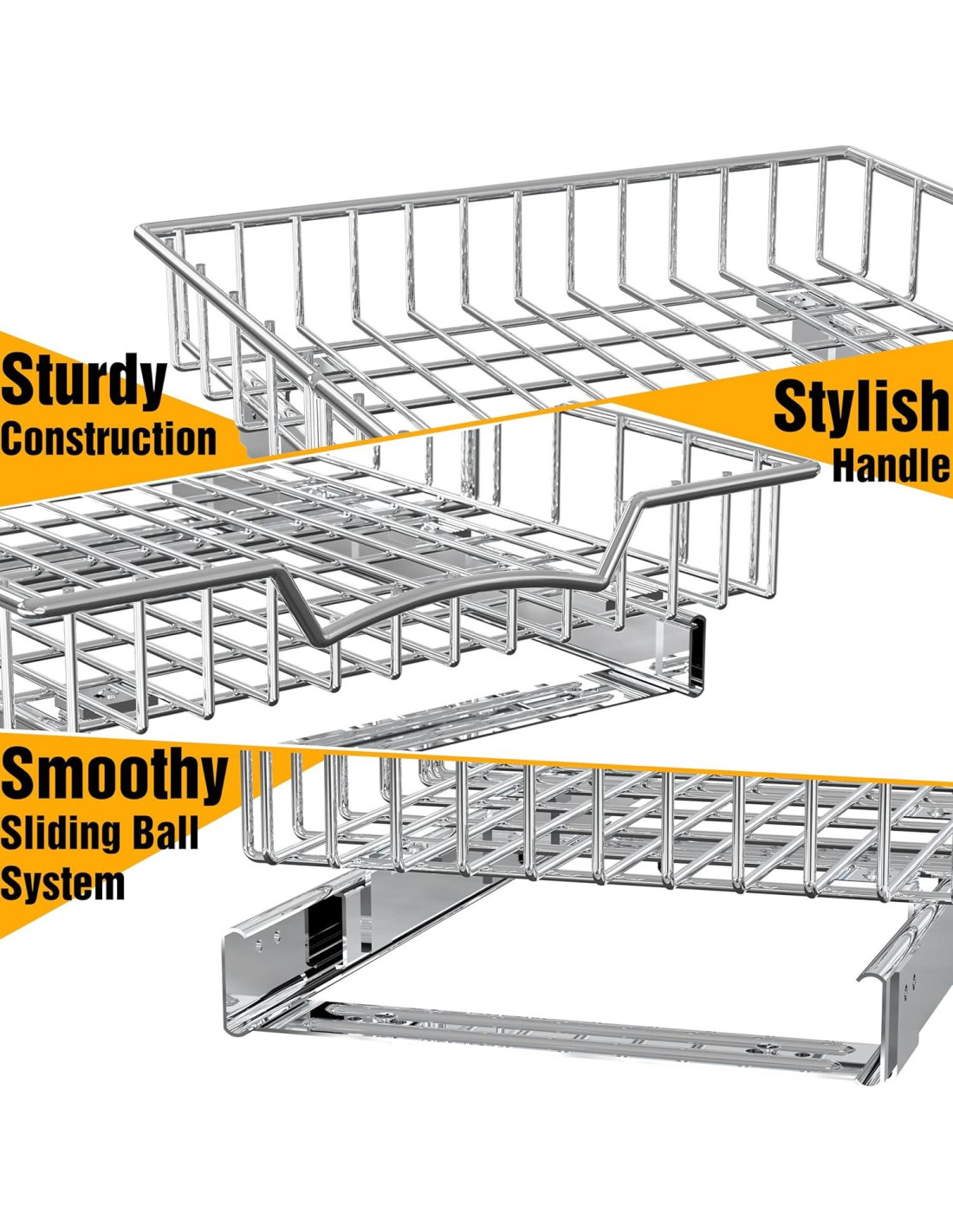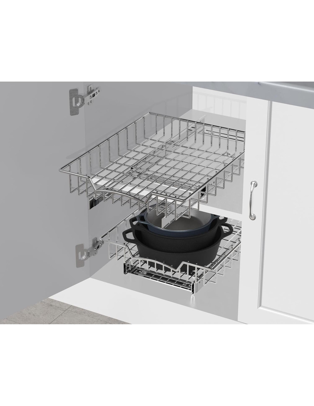 - La cesta se desliza fácilmente para alcanzar las cosas dentro del gabinete.
