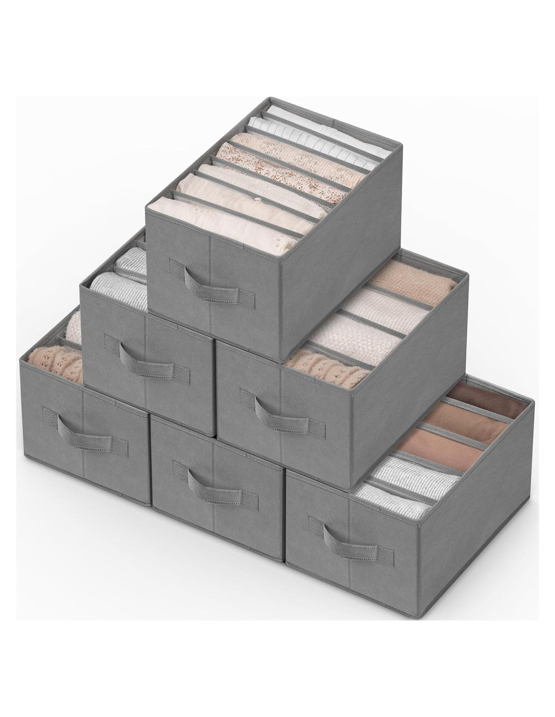 - Gran capacidad: En comparación con otros productos en el mercado, nuestro conjunto de 6 organizadores de ropa para armario tiene 33 compartimentos para una variedad de necesidades de almacenamiento. Cada organizador de armario mide 14.2"L x 9.8"W x 7.9"H (36,07 cm x 24,89 cm x 20,07 cm). Perfecto para organizar pantalones, leggings, suéteres, sudaderas, camisas, faldas, bufandas, sujetadores grandes, toallas, ropa de niños y más. Los divisores ayudan a mantener los artículos organizados y facilitan el acceso a la ropa que necesitas. Especialmente adecuado para armarios, estanterías y closets