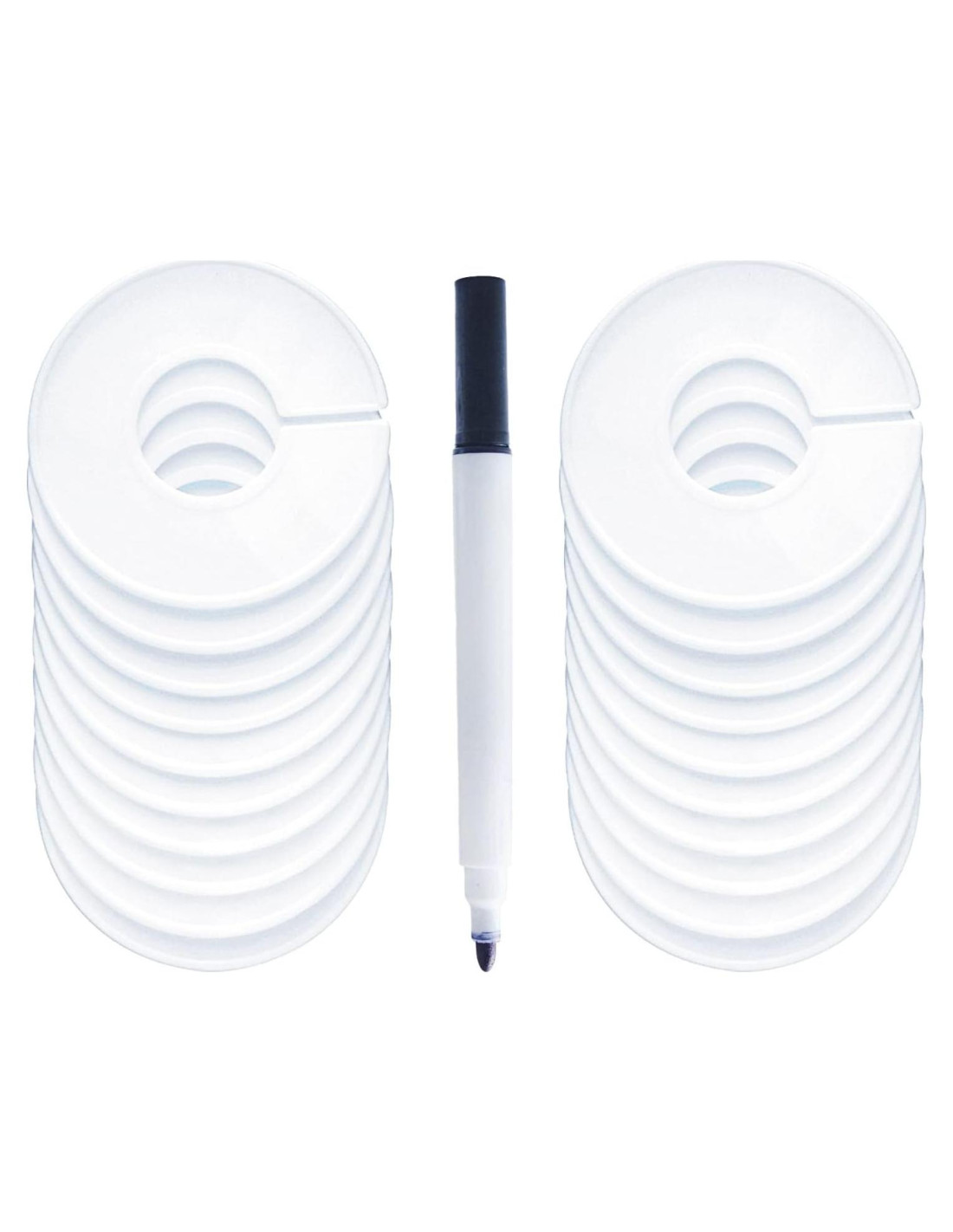 - Paquete Incluido: 20 piezas de divisores de tamaño para ropa de armario y 1 marcador negro. Un conjunto de 20 etiquetas para perchas para armarios en casa o en tiendas de ropa es muy conveniente para separar tamaños de ropa.