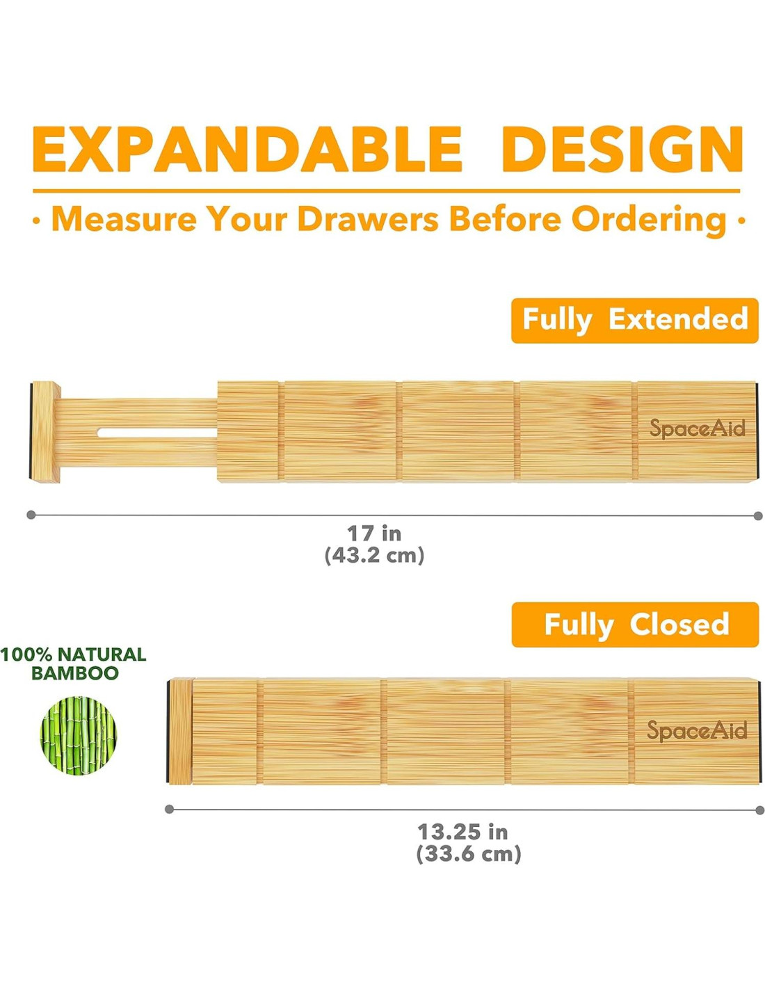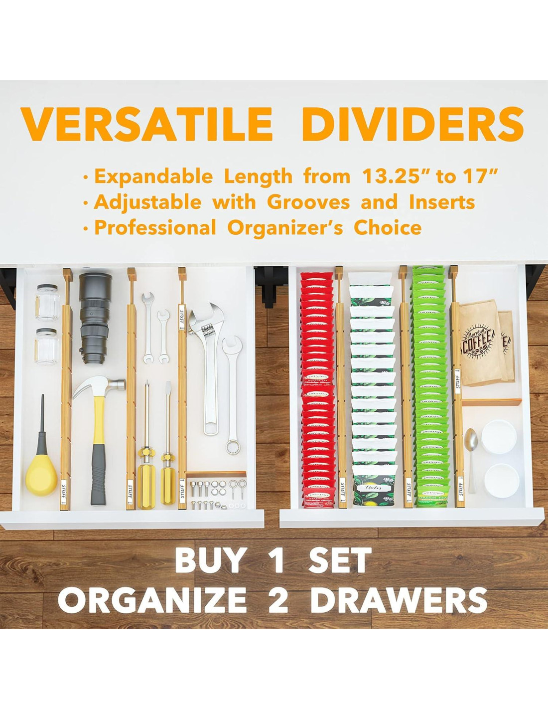 - Organización Expandible Ajustable: Cada divisor de cajón mide 5.97 cm de ancho, 1.52 cm de grosor y se expande de 33.66 cm a 43.18 cm de longitud total; Adecuado para la mayoría de los cajones en tu hogar, cocina, dormitorio, baño, armario y oficina
