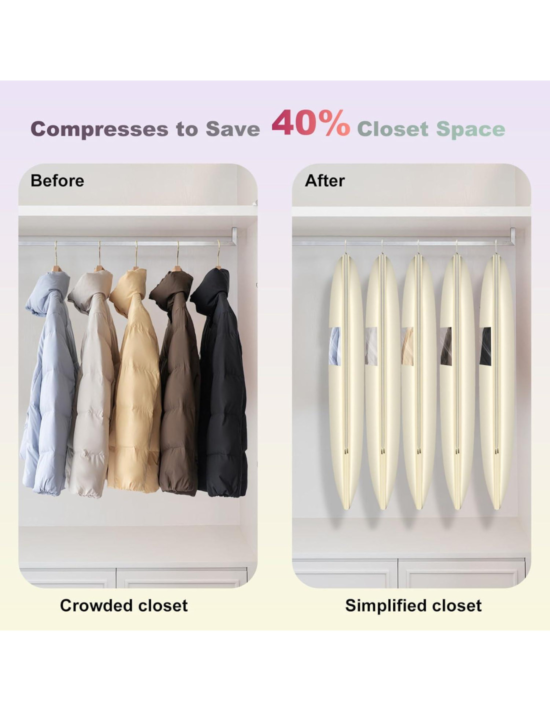 - Ahorra Hasta un 50% de Espacio en el Armario: Estas bolsas de ropa tienen un cierre adicional que te permite llenarlas y luego comprimirlas al cerrar. Te ayuda a minimizar la cantidad de espacio ocupado al almacenar prendas de tamaño similar, como abrigos de invierno y chaquetas de plumas. ¡Di adiós a los armarios desordenados y hola a un guardarropa ordenado y simplificado!