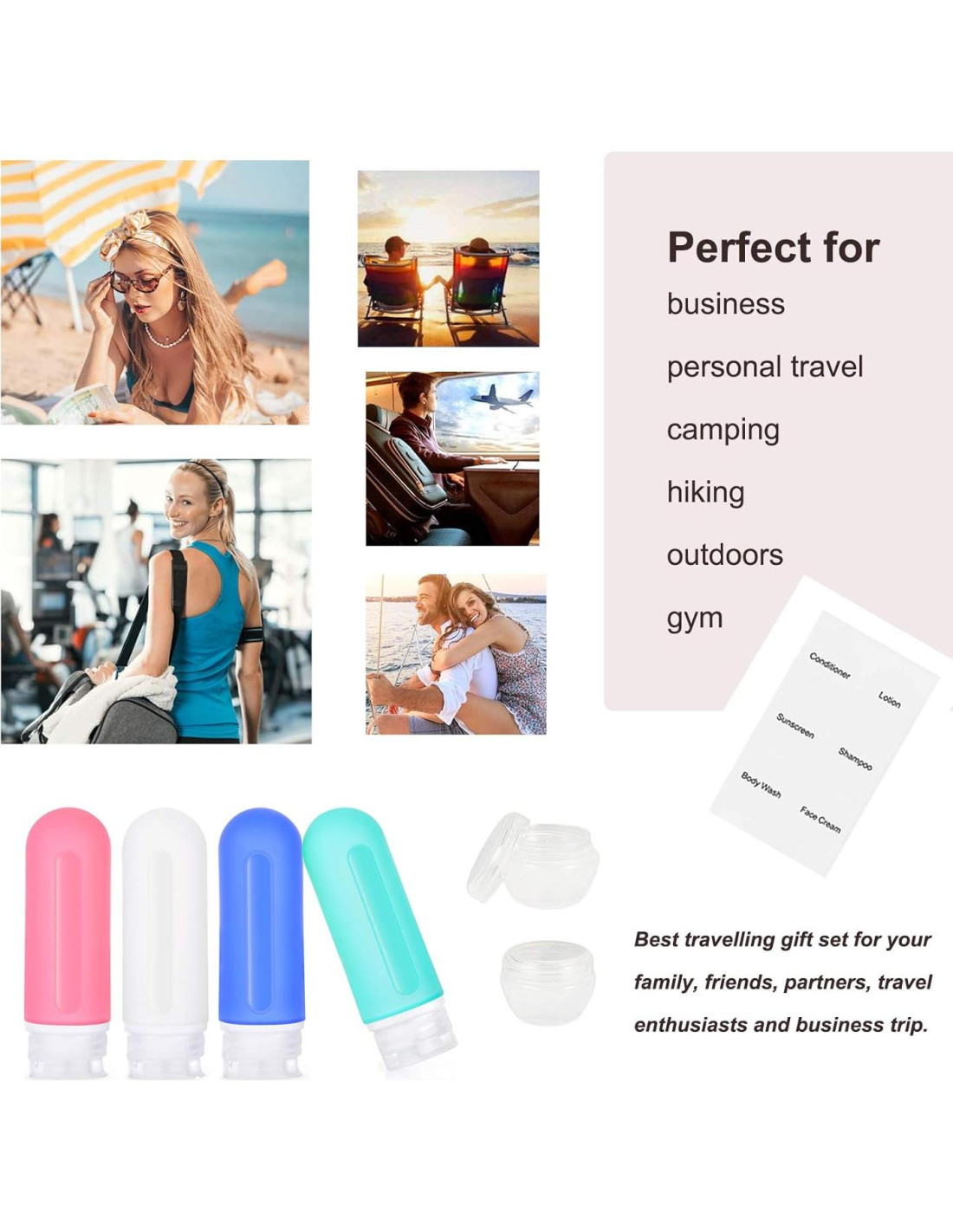 - Juego de botellas de viaje 4 botellas de silicona para viaje (3 oz, 89 ml), 2 tarros de crema (10 g), etiquetas. Empacadas ordenadamente en una bolsa, hacen que tus chequeos de seguridad sean rápidos y sin estrés. Perfecto para viajes de negocios o personales, camping, senderismo, diversión al aire libre, gimnasio.