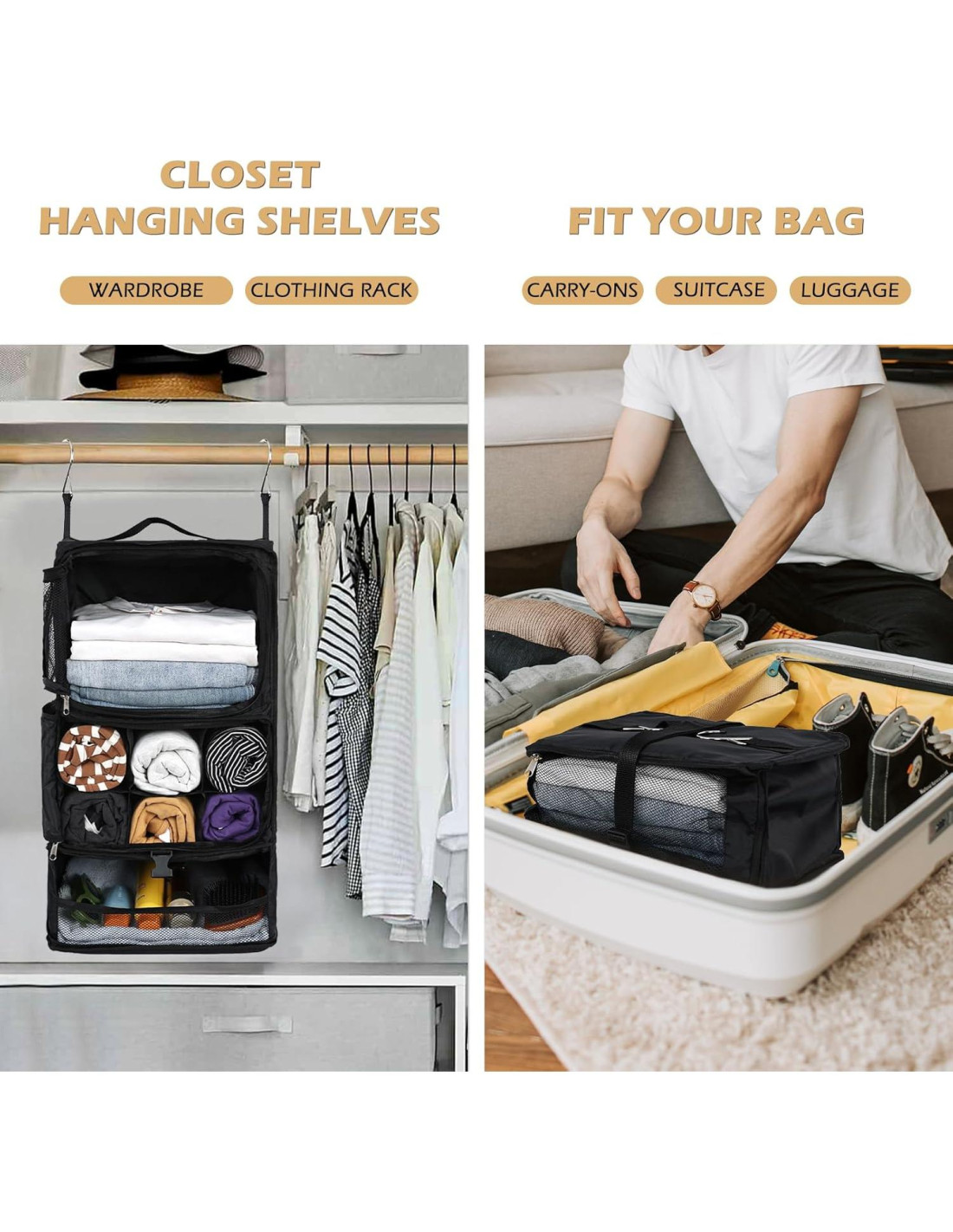 - Diseño plegable: El organizador de armario colgante para viajes tiene hebillas y cremalleras fáciles de abrir, puedes poner artículos y abrochar, fácil de organizar tu maleta cuando viajas. También puedes usar un fuerte gancho de acero inoxidable para colgarlo en el armario o baño.