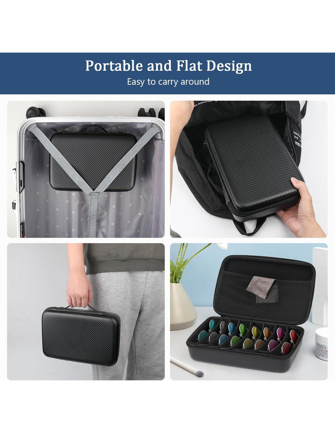 - Protección Potente y Diseño que Ahorra Espacio: Nuestro estuche de gafas de sol de viaje está diseñado con una duradera carcasa dura de EVA envuelta en elegante cuero de fibra de carbono negro que protege las gafas de sol de impactos, mientras que el interior de forro suave de alta calidad previene rayones. Las medidas de este organizador de gafas de sol son 29 cm x 19 cm x 7 cm, ocupando un espacio mínimo y facilitando su almacenamiento en una mochila o maleta. Ideal para el almacenamiento de múltiples pares de gafas de sol y gafas durante vuelos, viajes por carretera o desplazamientos diarios.