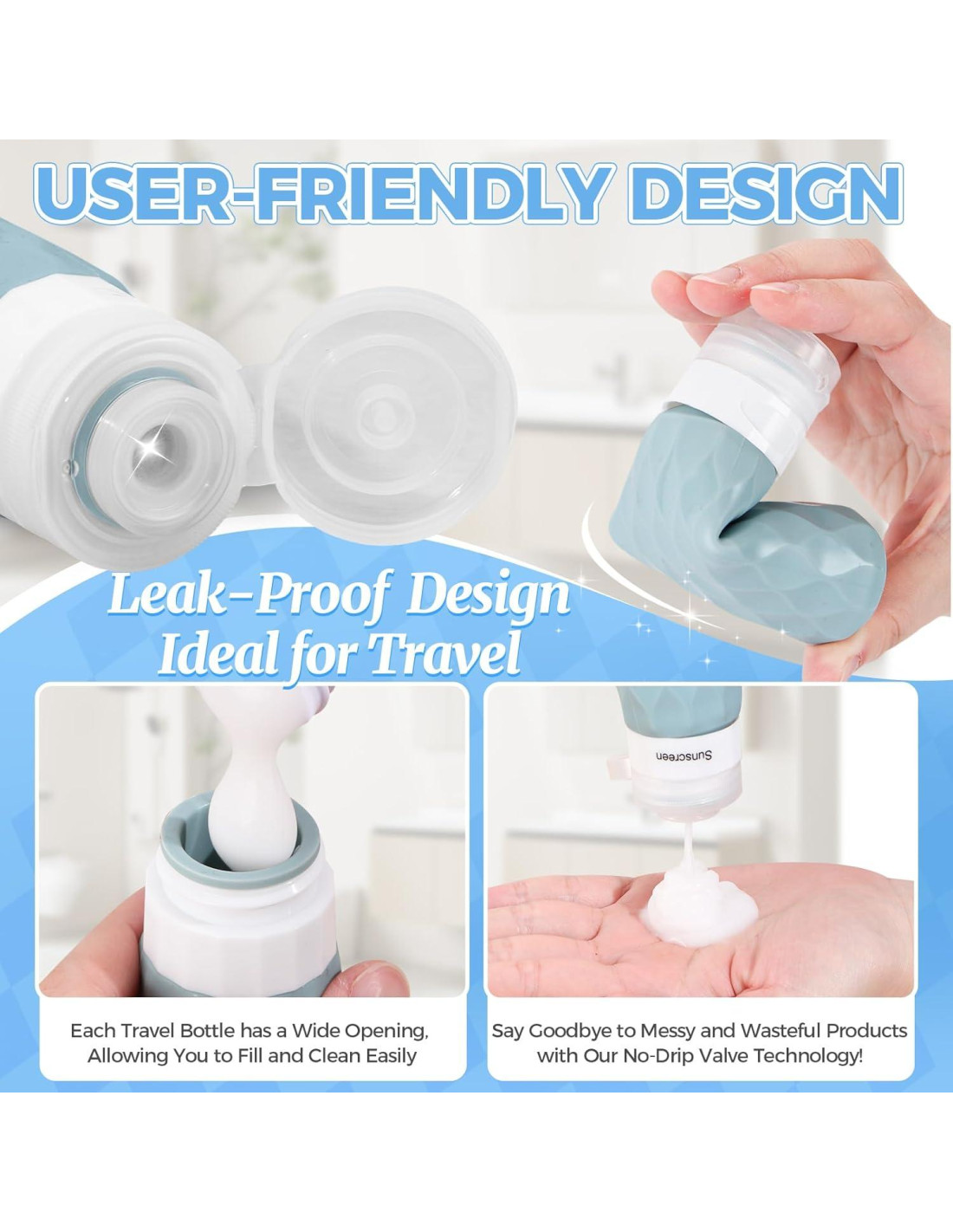 - [SILICONA SIN BPA] El Set de Contenedores de Artículos de Tocador de Tamaño de Viaje incluye 4 botellas de viaje de silicona, 4 tarros de crema de silicona para viaje y 2 cubiertas de botellas de silicona hechas de silicona premium sin BPA, lo que significa que tus artículos no estarán contaminados por toxinas. Usa tus artículos de cuidado personal diarios en cualquier lugar