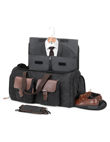 - Bolsas de Ropa 2 en 1 para Viaje: Esta bolsa de viaje para ropa combina la funcionalidad de una bolsa de ropa y una bolsa de viaje tipo duffel. Cuando está desplegada, sirve como una bolsa de traje colgante para el hogar, y cuando está ensamblada, se transforma en una bolsa de duffel de negocios. Presenta un diseño sin arrugas con dos clips internos y un sujetador, asegurando que tu traje o vestido permanezca sin arrugas en todo momento