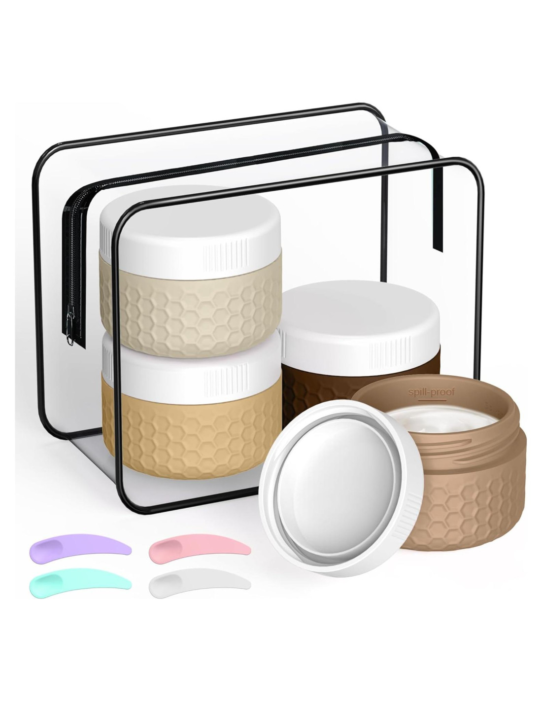 - Componentes incluidos: 4 Tarros + 4 Espátulas + 1 Bolsa de Artículos de Tocador