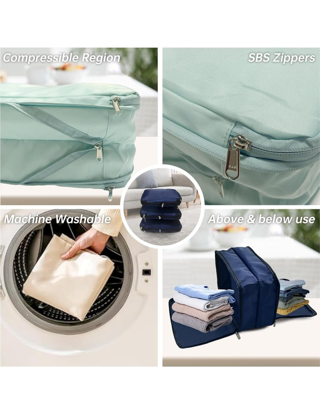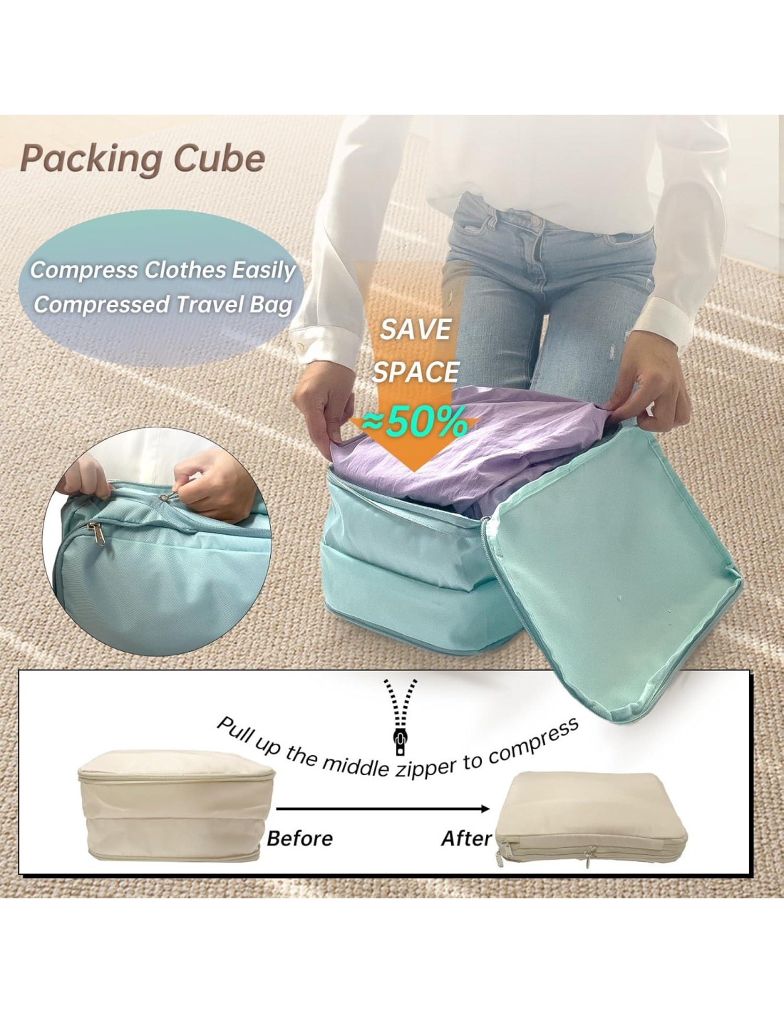 - [AHORRA ESPACIO EN TU EQUIPAJE] Cada Cubo de Empaque Compresible tiene un sistema de compresión de doble cierre que lleva el espacio del equipaje a un nuevo nivel, ayudando a ahorrar espacio en su equipaje de mano o mochila de viaje. La compresión ahorra hasta un 50% de espacio de almacenamiento y mantiene sus prendas organizadas y fácilmente accesibles al viajar.