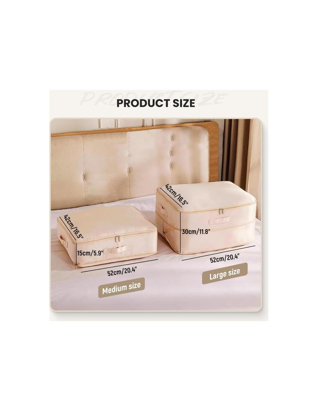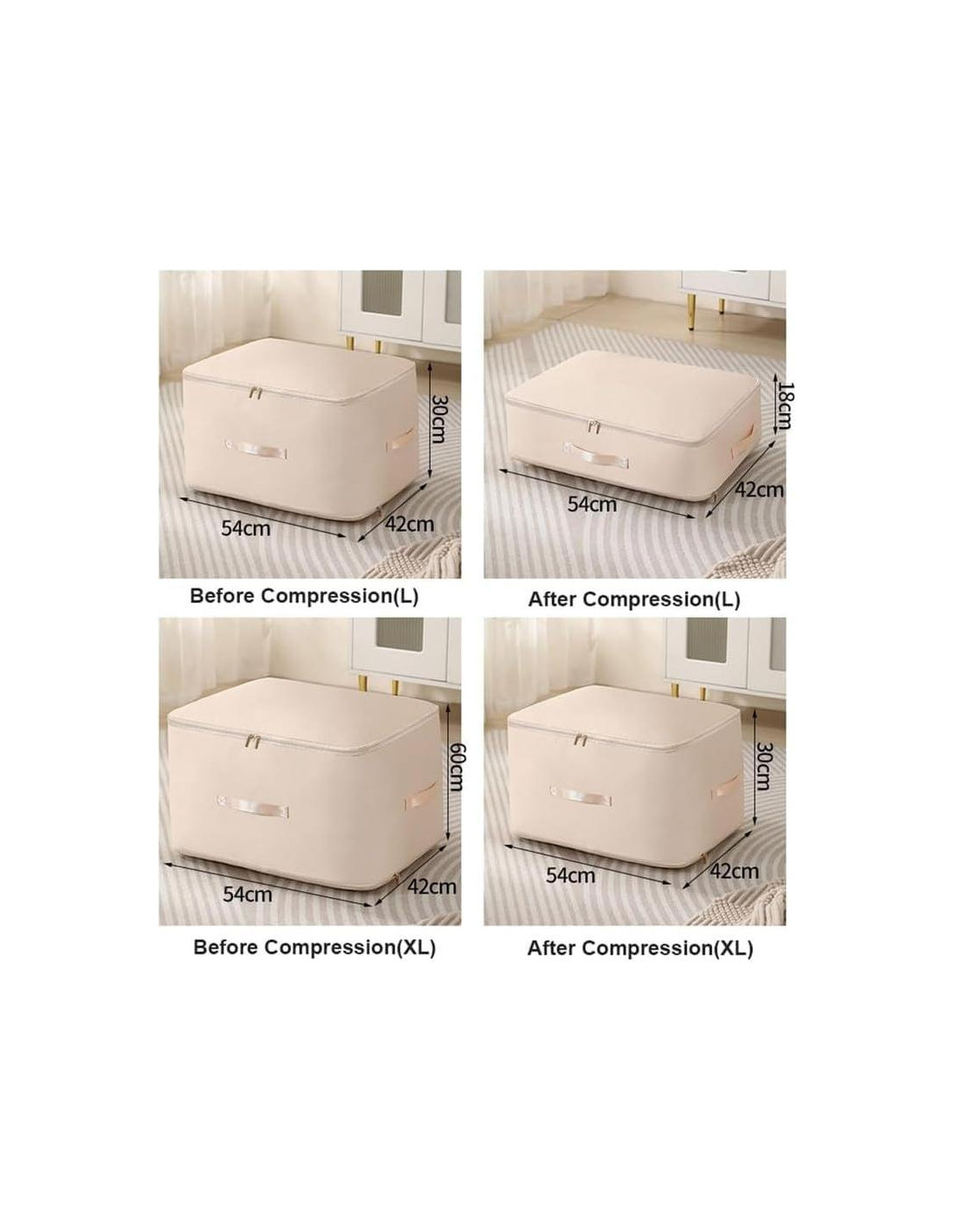 Organizador de Compresión Autoahorrador de Espacio, Bolsa de Almacenamiento de Edredón de Compresión Nueva 2024 de Gran Capacidad, Bolsas Organizadoras de Mudanza de Compresión Autoahorradora de Alta Resistencia para Edredones. Funciona como un sellador al vacío. Solo necesitas: 1. Doblar tu ropa y edredón, y aplanarlos. 2. Empacar la ropa en los cubos y cerrar el zipper normal. 3. Poner un dedo en la parte trasera del zipper en el espacio al comprimir los cubos de empaque para evitar que el zipper se quede atascado en la tela. TAMAÑO: Grande - 15.75*11.8*7.08in (40*30*18cm) XL - 21.26*16.53*23.62in (54*42*60cm) PAQUETE INCLUYE: 1* Organizador de Compresión Autoahorrador de Espacio Ultra