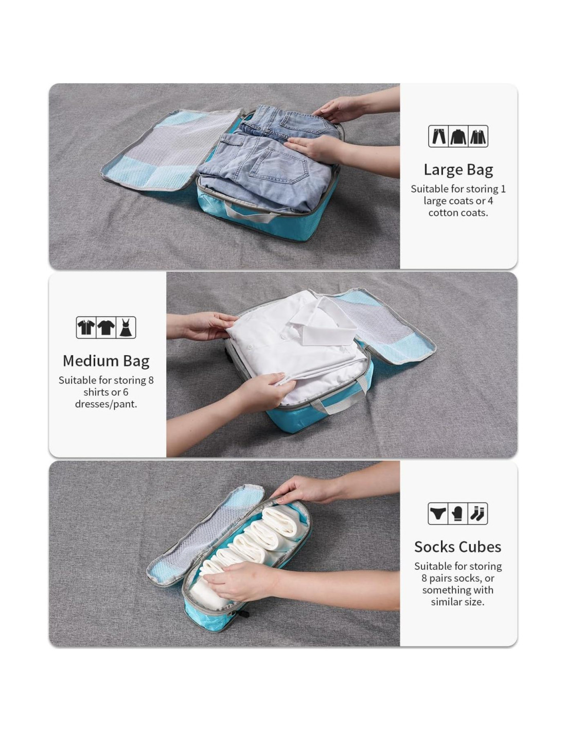 - EMPAQUE SIN ARRUGAS Nuestros cubos de empaque de compresión pueden ayudar a reducir las arrugas en tu ropa manteniéndola ordenadamente empacada. Llega a tu destino con ropa que se vea tan fresca como cuando la empacaste. Una gran manera de mantenerte organizado para almacenamiento diario, viajes de negocios, mochilear, acampar, hacer senderismo, viajar en casa rodante y vacaciones. Usa diferentes cubos para separar ropa limpia de la ropa sucia durante tu viaje.