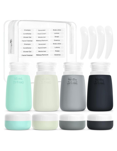 - [Juego de Botellas de Viaje para Artículos de Tocador] El juego WLEAD incluye 4 botellas de silicona y 4 tarros de crema, perfectos para almacenar tus artículos de tocador favoritos. Cada contenedor está diseñado para fácil transporte, convirtiéndolo en un imprescindible para cualquier viajero.
