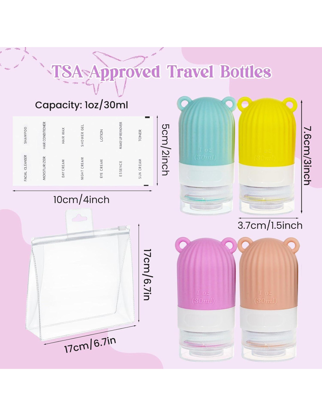 Características: La tapa se ajusta firmemente y hace un buen sello. Tienen bocas anchas que son fáciles de rellenar. Las botellas son suaves y flexibles, fáciles de apretar. Los colores brillantes de las botellas son geniales para mujeres y hombres. Las botellas también llegaron en una bolsa de viaje clara con cierre. Las adorables botellas de tamaño de viaje son suficientes para el bolsillo del abrigo o el bolso. Especificación: Material: silicona de grado alimenticio Color: rosa, azul, amarillo, naranja Capacidad: 1oz/30ml Tamaño de la botella: 1.5*3in (3.7*7.6cm) Paquete incluye: 4 x Botellas (30ml/1oz) 1 x Etiqueta de Aseo 1 x Bolsa de PVC