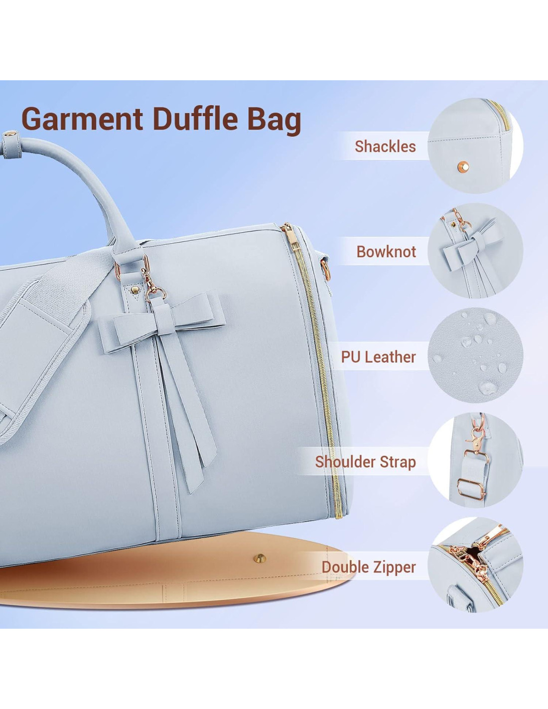 - Una Bolsa de Ropa con Multifunciones: Combinada de manera elegante, esta bolsa de ropa azul para viajar está hecha de cuero PU. No solo es una bolsa de mano convertible, sino también una bolsa para vestido de novia. Se diseñó un lazo desmontable para que se ajuste a diferentes estilos. En la parte frontal de la bolsa de traje se estableció un bolsillo para poner tu pasaporte y teléfono. ¿Te diriges a un viaje de luna de miel, una boda de destino, una escapada de fin de semana o un viaje de negocios? ¡No te la pierdas!