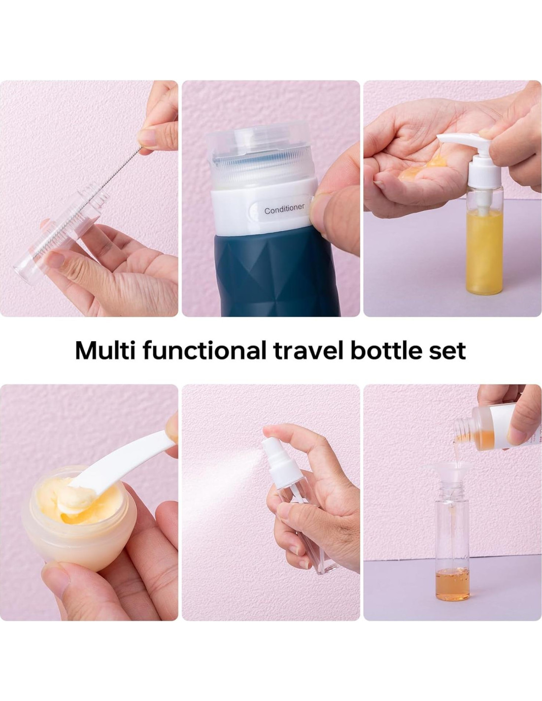 - 20 Piezas de Accesorios de Viaje Útiles - 4 botellas de viaje (90ml/3oz), 4 tarros de crema (10ml/0.3oz), 2 botellas de spray (30ml/1oz), 1 botella con bomba (30ml/1oz), 4 cucharas, 1 embudo, 1 cepillo de limpieza, 2 etiquetas adhesivas y 1 bolsa de aseo aprobada por la TSA. Adecuado para viajar, acampar u otras actividades al aire libre.