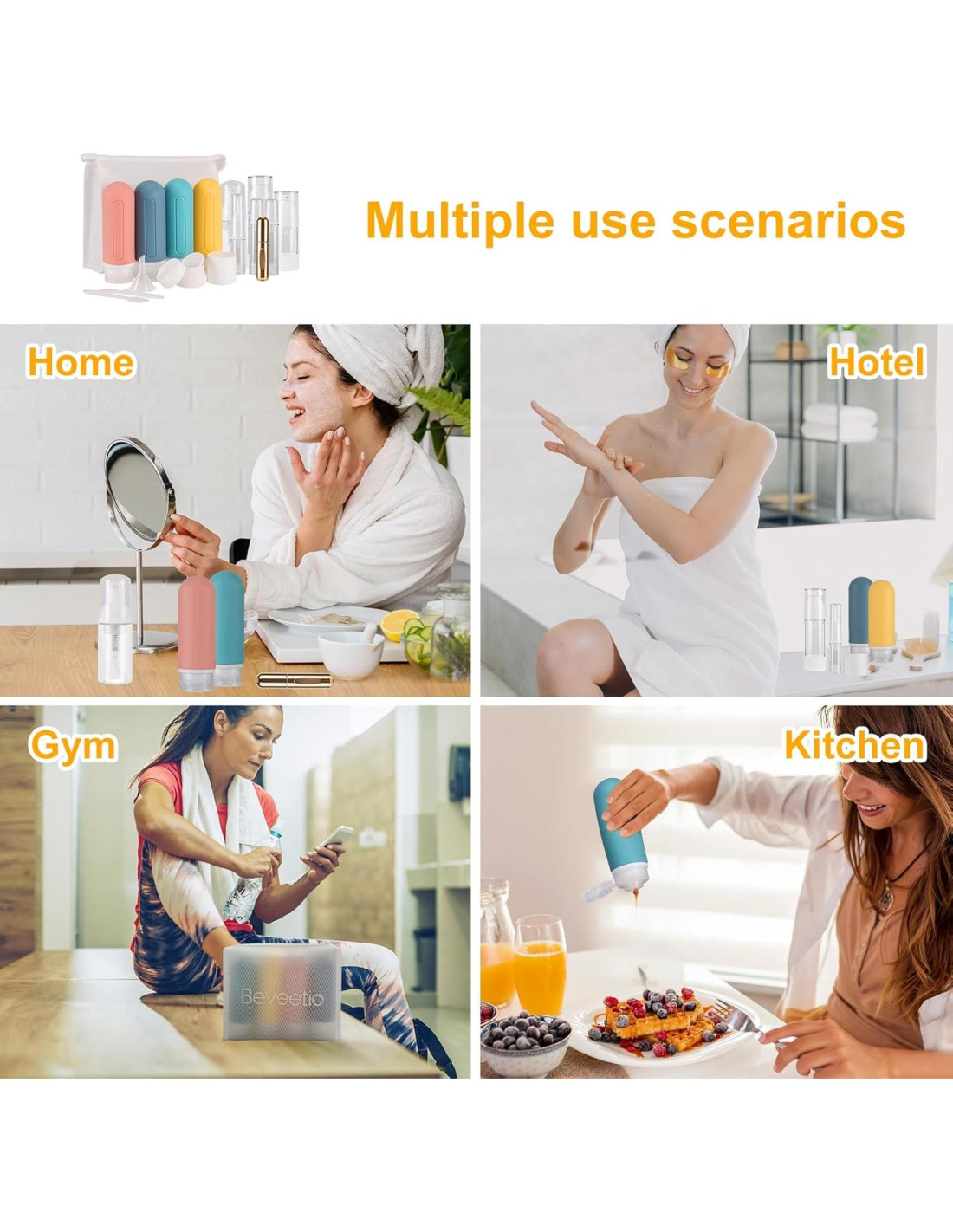 - [Conjunto de Multi-Combinación] Conjunto de 19 botellas de viaje a prueba de fugas Beveetio, portátil y ligero, fácil de llevar y limpiar. Obtendrás (4 Botellas de Viaje de Silicona + 2 Tarros + 1 Botella de Spray al Vacío + 1 Botella de Bomba al Vacío + 1 Botella Espumosa + 1 Botella de Perfume + 3 Mini Botellas de Bomba al Vacío + 2 Etiquetas de Página + 1 Embudo + 2 Cucharas + 1 Bolsa Transparente) ¡Compañero perfecto para tus viajes!