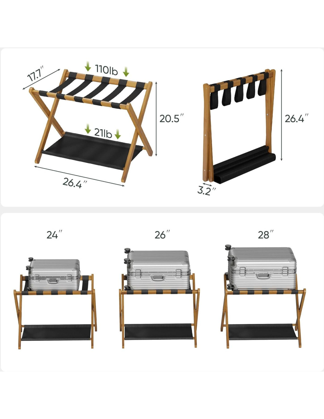 - Diseño Plegable: Los soportes para equipaje plegables son muy livianos y se pliegan para un almacenamiento compacto y fácil. Un conjunto de soportes para maletas puede sostener maletas de 24", 26" o 28" (61 cm, 66 cm o 71 cm). Con dimensiones de 26.6"L x 18.1"W x 20.5"H (67,34 cm x 45,72 cm x 52,07 cm) y plegado a 26.4"L x 3.5"W x 26.6"H (67,06 cm x 8,89 cm x 67,34 cm). La estantería inferior adicional proporciona espacio extra de almacenamiento para zapatos, bolsas u otros artículos pequeños.