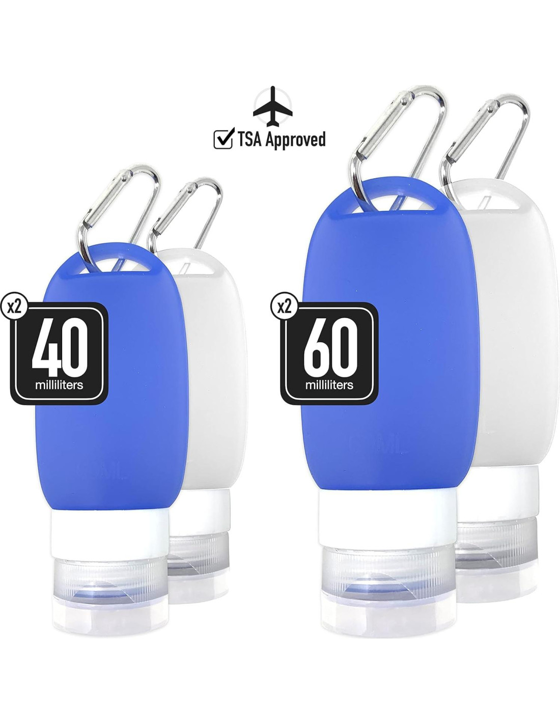 - TAMAÑO DE VIAJE: El juego de botellas de silicona viene con DOS botellas de 59 ml y DOS botellas de 41 ml y estuche a prueba de fugas