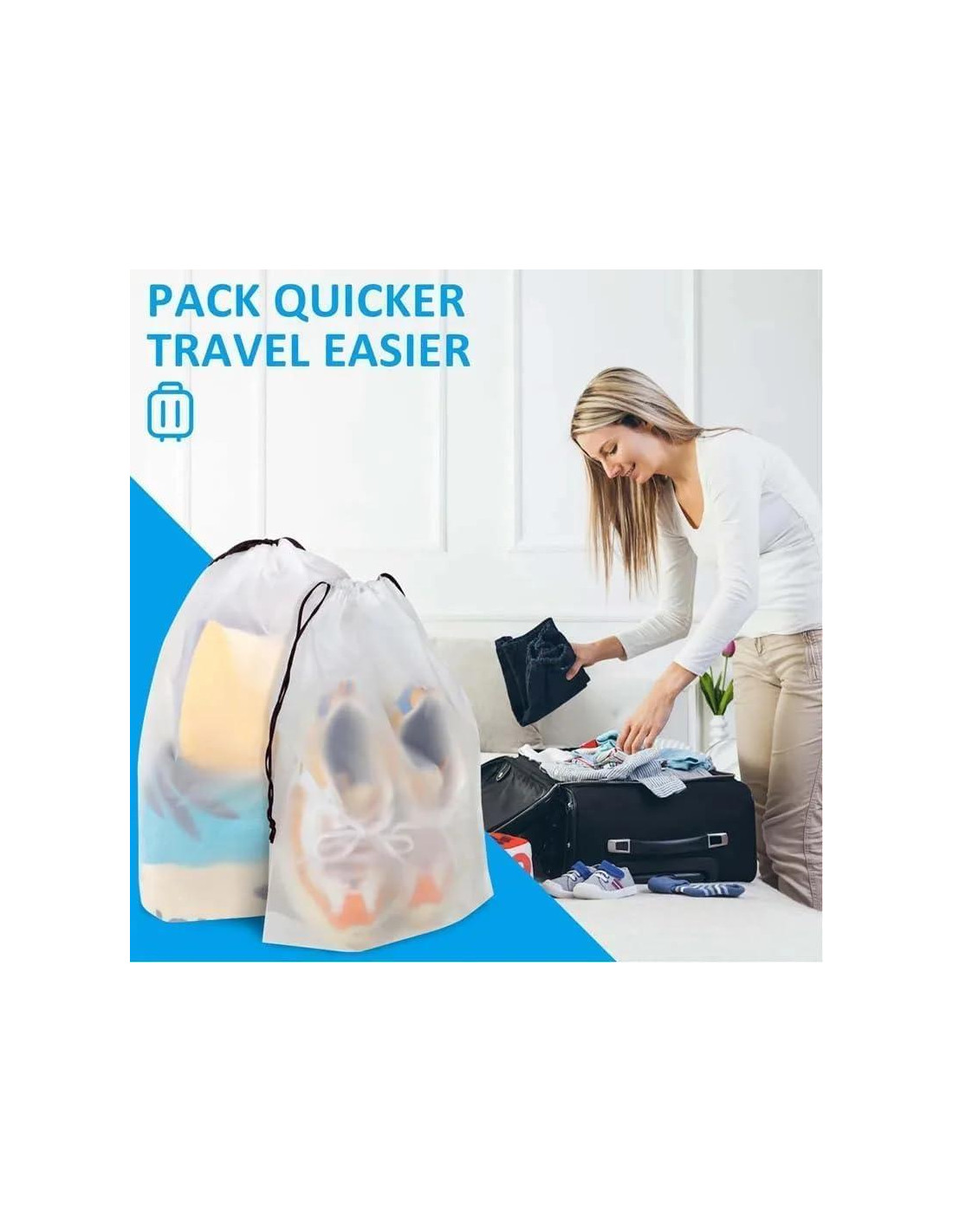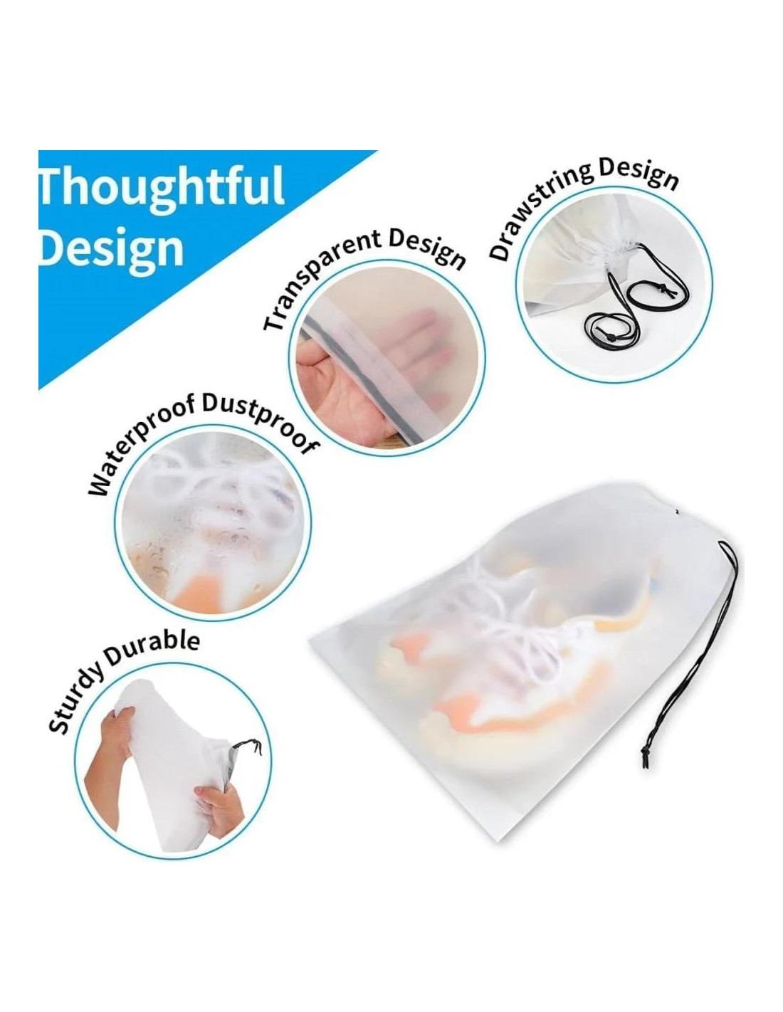 - Resistente y Reutilizable - Con costuras reforzadas y un cierre de cordón, estas bolsas para zapatos están diseñadas para durar y pueden reutilizarse para almacenamiento a largo plazo o viajes frecuentes.