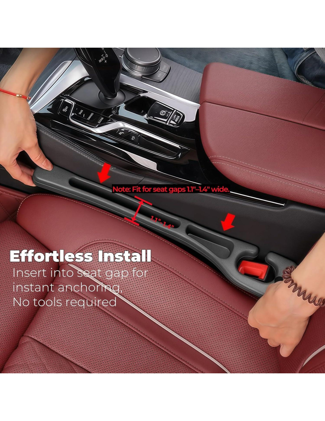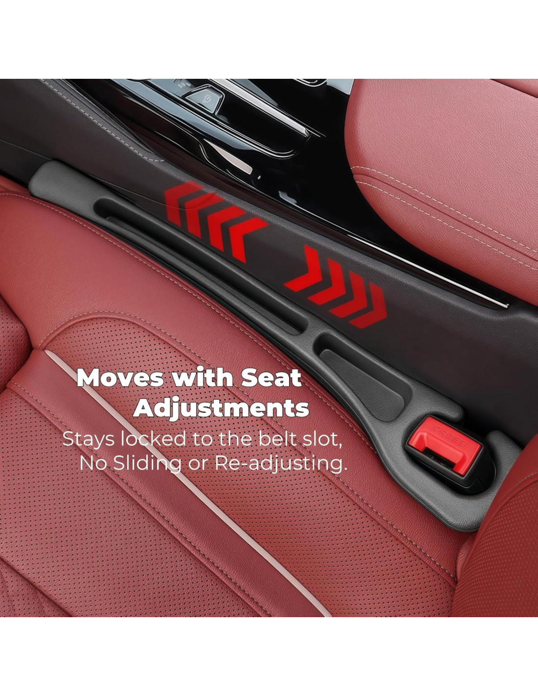 - Fácil instalación: Accesorios de coche universales. ¡Instala fácilmente el relleno de espacio entre asientos en segundos! Se conecta al broche del cinturón de seguridad a través de una ranura incorporada, se mueve con tu asiento y proporciona una cobertura del 100% del espacio en frente, alrededor y detrás del broche, sin necesidad de reajuste.