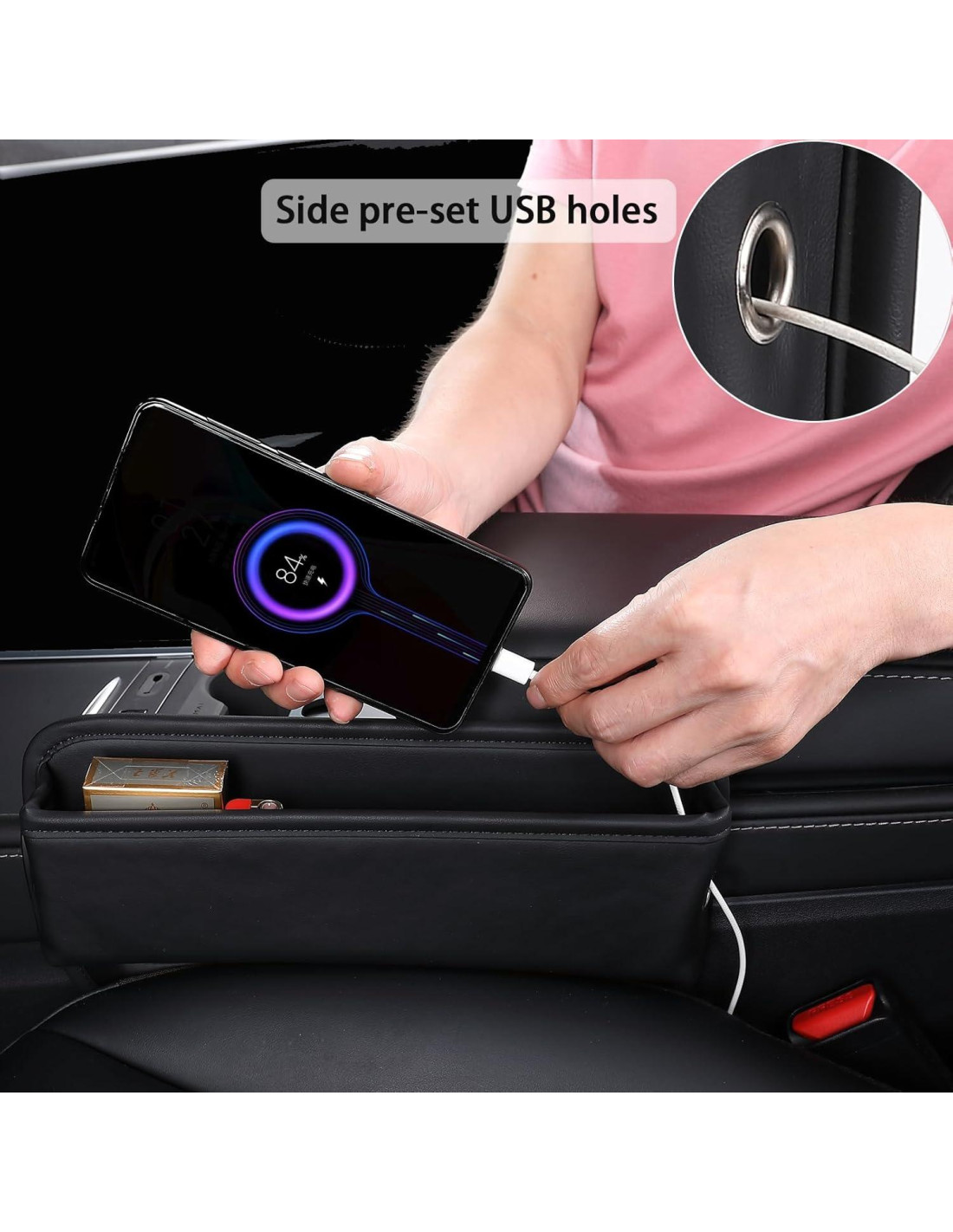 - 4. Seguro y No Interfere - Nuestra Caja de Almacenamiento para Espacio entre Asientos no bloqueará los cinturones de seguridad ni los portavasos. Su diseño delgado asegura la seguridad durante la conducción o el frenado, sin impacto en el espacio para las piernas o ajustes del asiento. Una correcta instalación mantiene todo seguro.