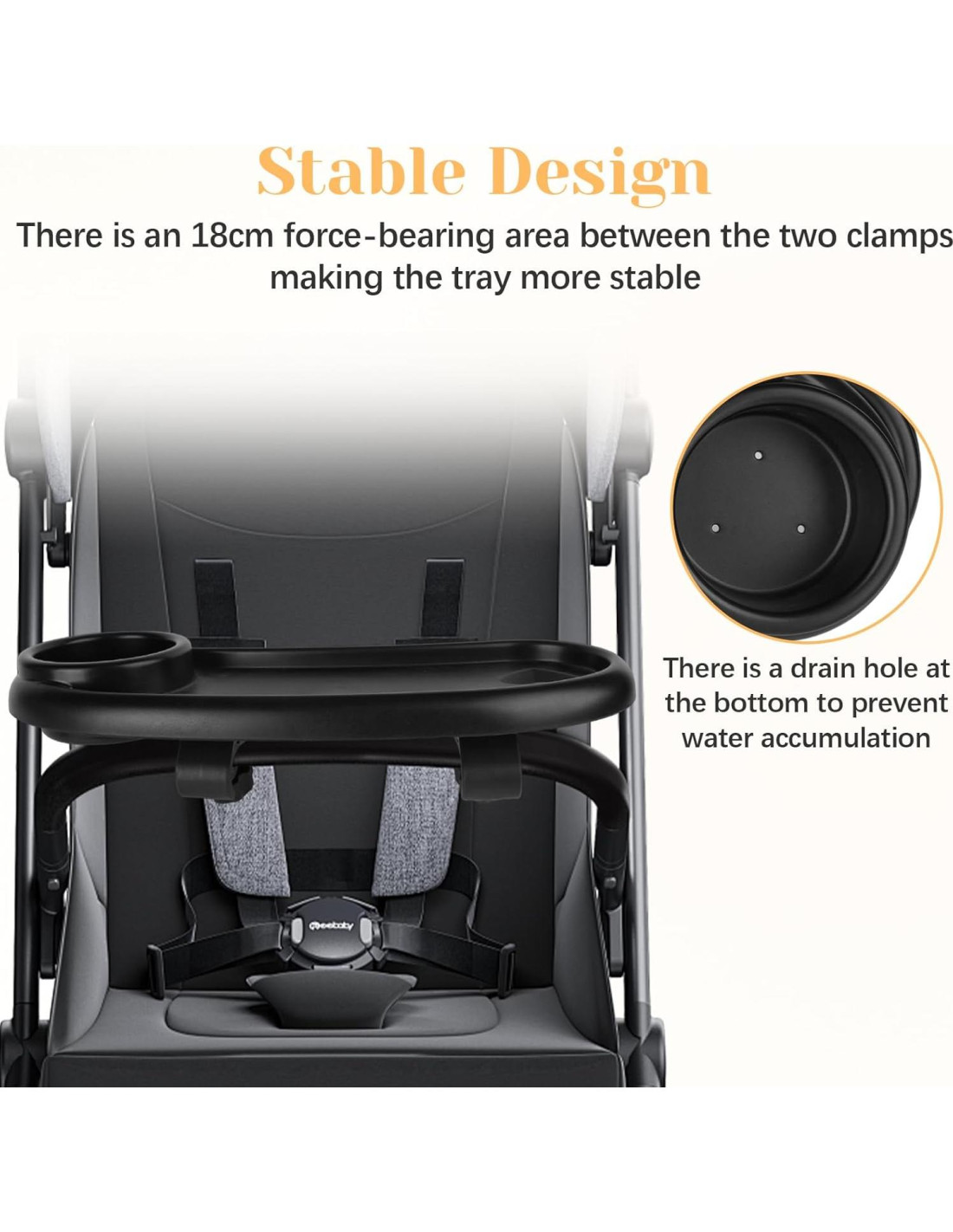 - Superficie Ampliada para Comodidad: La bandeja extra grande proporciona una superficie de 38 x 14 centímetros para snacks, tabletas o juguetes, mientras que el soporte para vaso elástico asegura las bebidas firmemente. Como bandeja para cochecito con diseño ergonómico, reduce la fatiga de los padres al mantener los elementos esenciales al alcance del bebé, perfecta para salidas largas o viajes