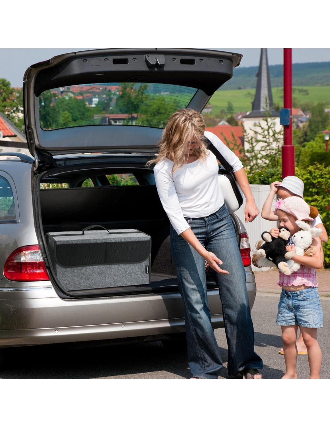 - El organizador de maletero de coche está hecho de material de fieltro, lo que aumenta la vida útil y es menos probable que se raye. Este material fue elegido para que la bolsa pueda almacenar una variedad de diferentes tipos de objetos y productos como herramientas, comestibles y equipo diverso.