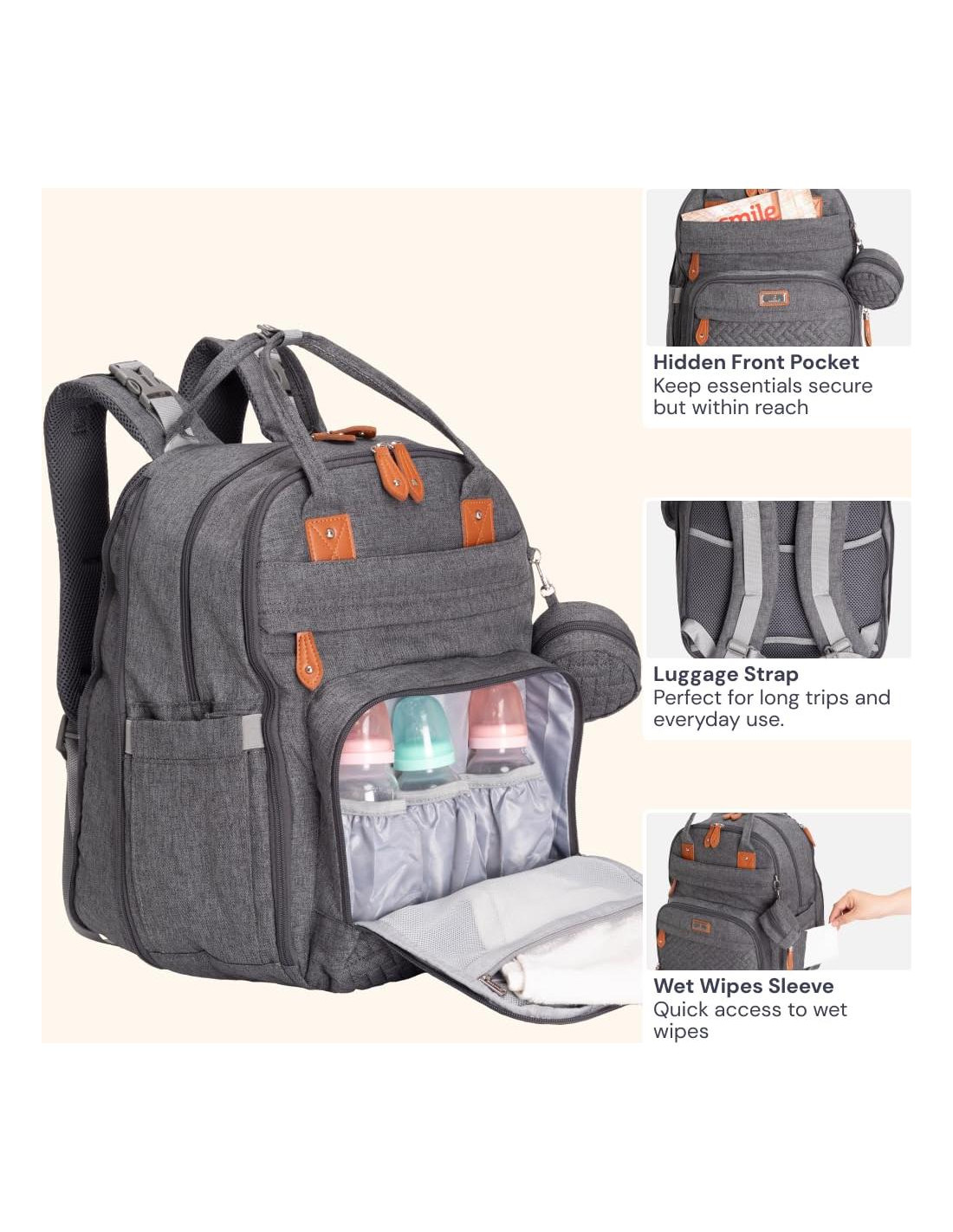 - Conveniente y Considerado - Manga para equipaje, asa superior de fácil agarre y clips convenientes para cochecito - usa esta mochila de pañales como una mochila de viaje esencial, un bolso de mano o sujétala a tu cochecito.