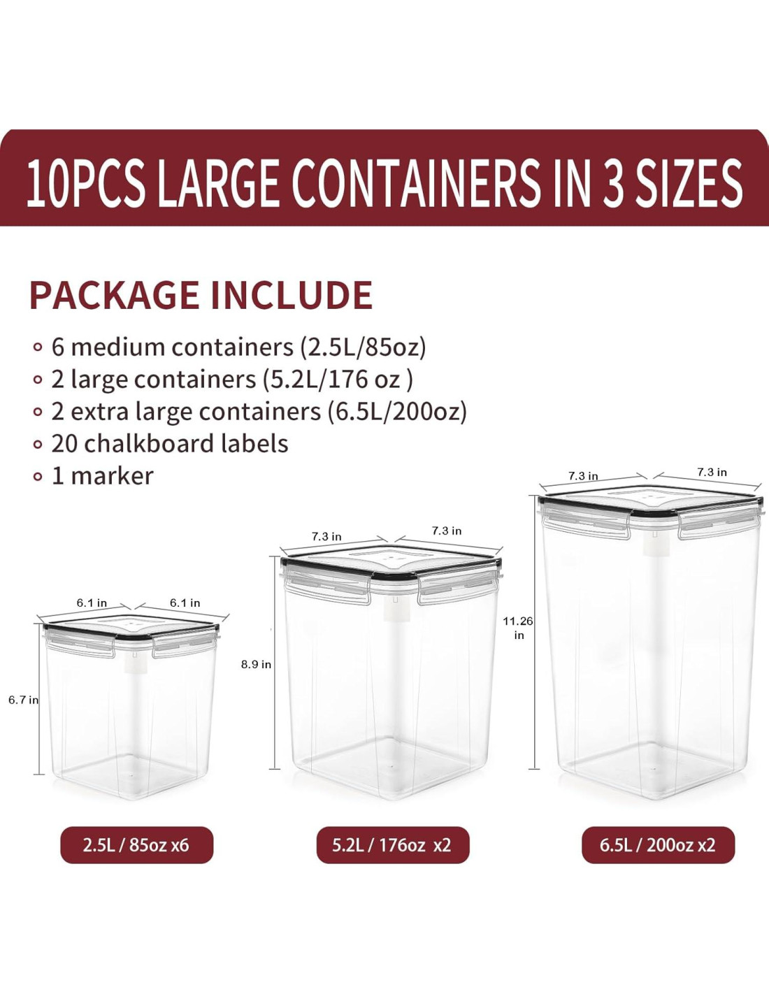 - Los Contenedores Justos: El conjunto de contenedores de harina y azúcar incluye 2 pcs tamaño EXTRA GRANDE 6.5L (220oz), 2 pcs tamaño GRANDE 5.2L (176oz) y 6 pcs tamaño MEDIANO. Regalo extra (pluma blanca + 20 pcs etiquetas de pizarra), que es muy adecuado para almacenar alimentos diarios.